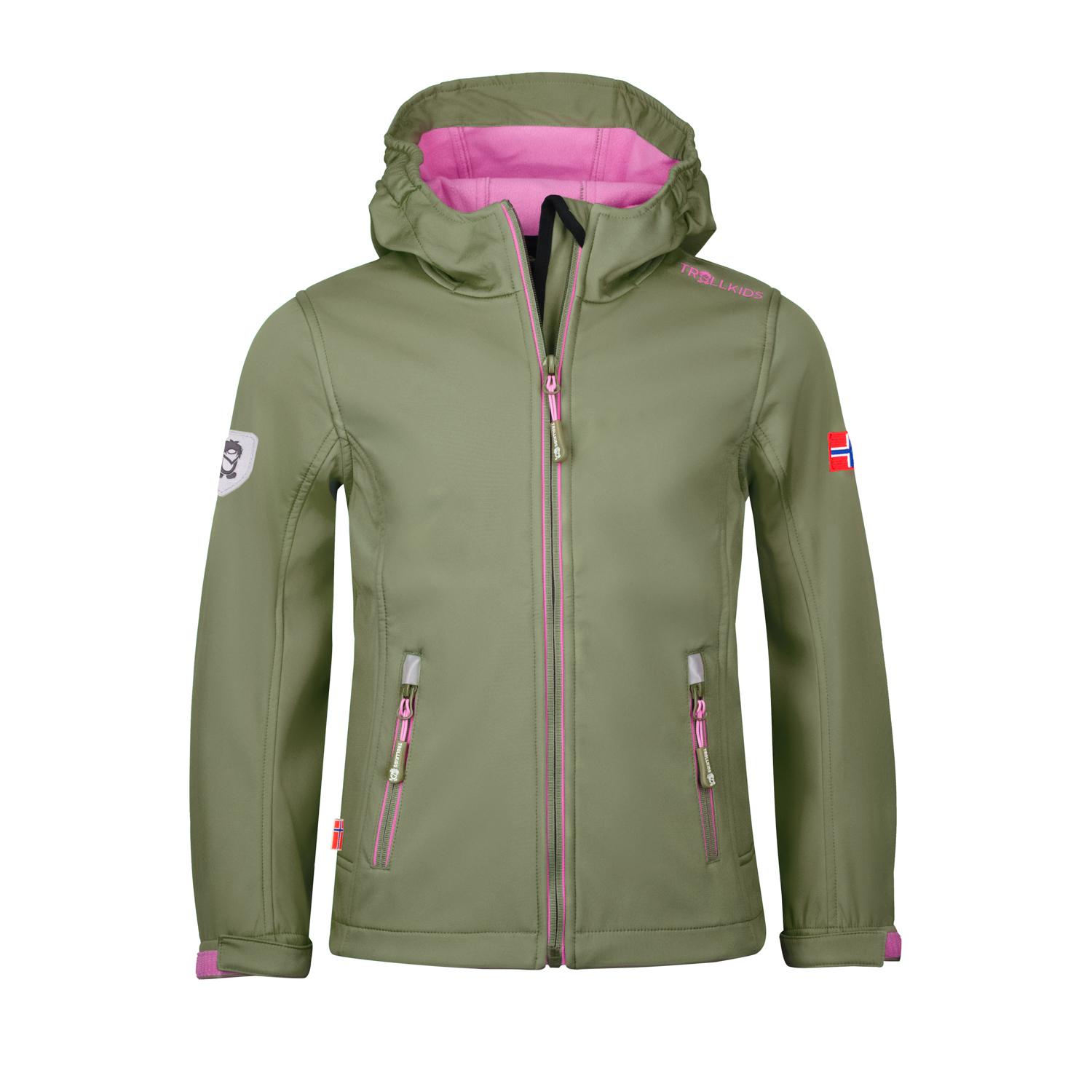Softshell-Jacke für Mädchen (leicht tailliert) mit Kontrastreißverschlüssen, wasserabweisend und winddicht, flexibel-elastisch und flauschig warm. ,Ein echtes Muss für die Übergangszeit und für Aktivitäten, bei denen ein hoher Bewegungsfreiraum benötigt wird. Darüber hinaus ein modischer Hingucker! Klettverschlüsse an den Armen sorgen dafür, dass die Ärmellänge angepasst werden kann und kein Wind durch die Bündchen dringt. Reflektoren befinden sich vorne und hinten, an den Oberarmen leuchten die norwegische Flagge und der beliebte Lonely Troll aus dem Trollkids-Logo. Obermaterial wasserdicht. Material Oberstoff: 100% Stretch-Polyester, Material Futter: 100% Fleece-Polyester.