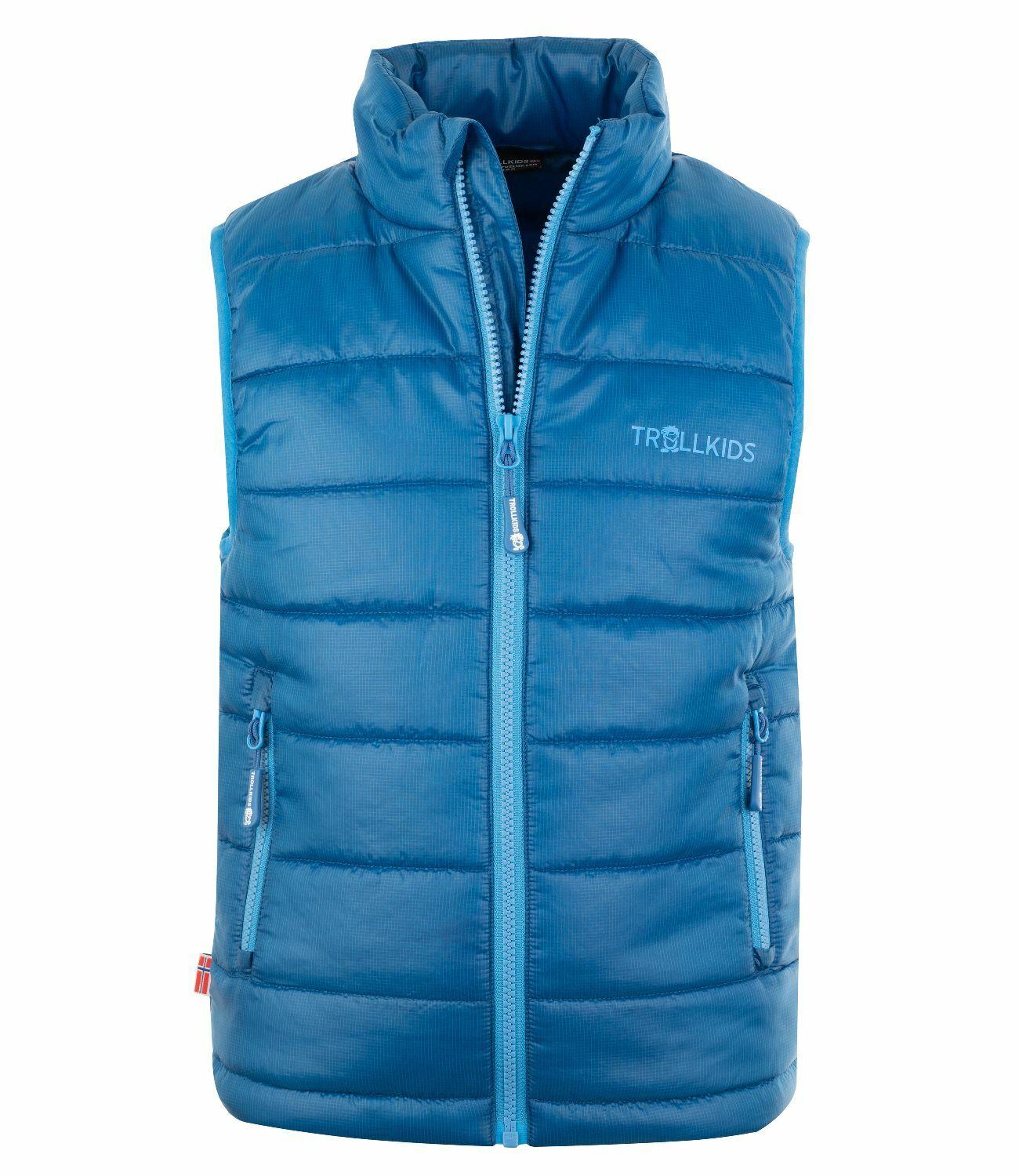 Die mit Polyfasern gefütterte Weste ist herrlich warm und trotzdem leicht (150 g bei Größe 128). Sie sieht aus wie eine Daunenjacke, hat ähnliche Wärmeeigenschaften, ist aber weniger nässe- und schmutzempfindlich: Die wasserabweisende Mikrofaser wärmt im Gegensatz zur Daune auch bei Nässe und kann jederzeit problemlos in der Waschmaschine gewaschen werden. Der Außenstoff besteht aus extrem feingewebten Polyestergarnen und ist dadurch winddicht. Material: 100 % Polyester, atmungsaktiv.