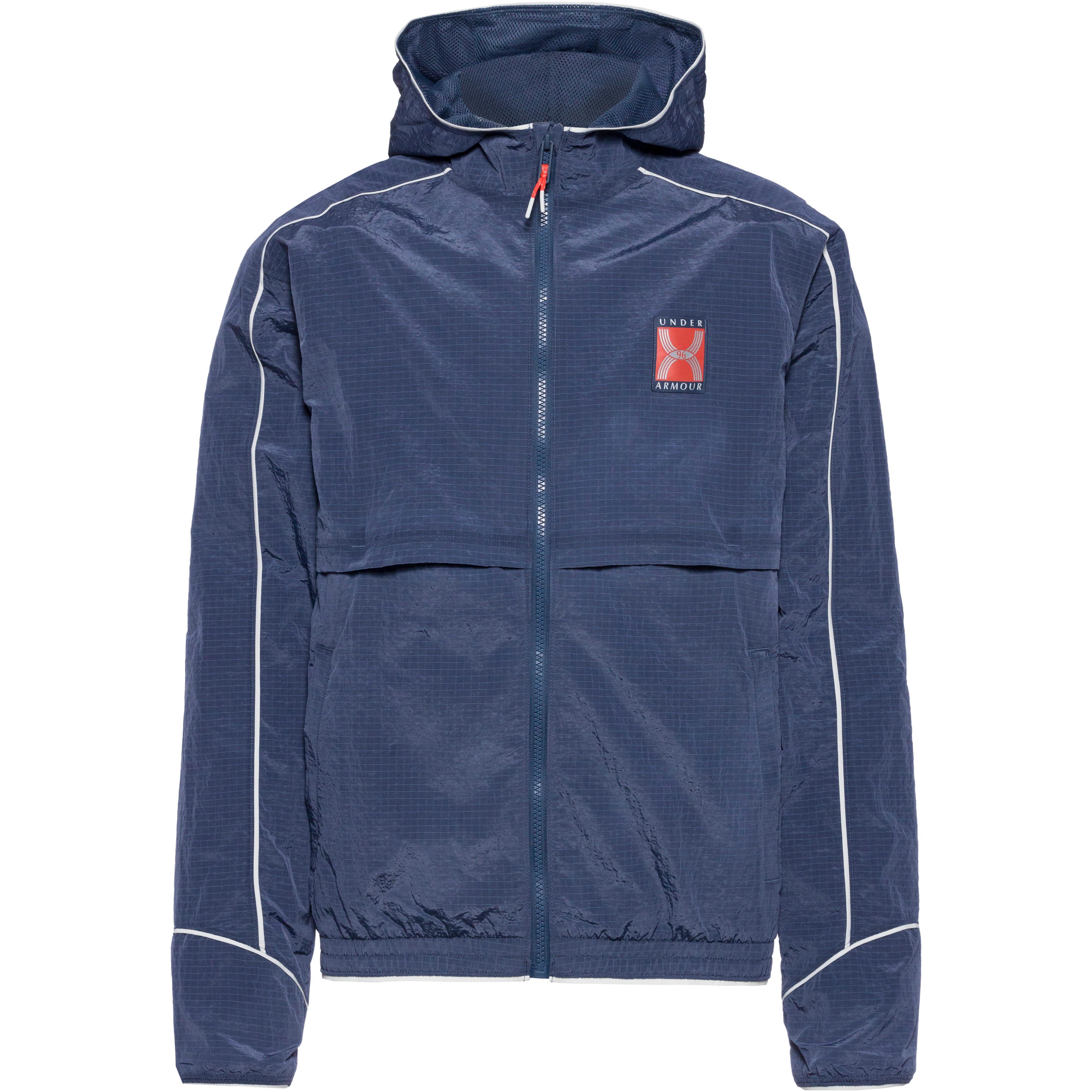 Laufjacke mit wasserabweisender UA Storm-Technologie; Design inspiriert aus dem Jahr 1996, dem Gründungsjahr von Under Armour; leichtes Ripstop-Gewebe mit Crinkle-Textur; atmungsaktiv und strapazierfähig; elastische Einsätze; Kapuze mit Gummizug; seitliche Eingrifftaschen mit Reißverschluss; Meshfutter; leicht verkürzter Schnitt; normale Passform; Material 100% Polyamid.