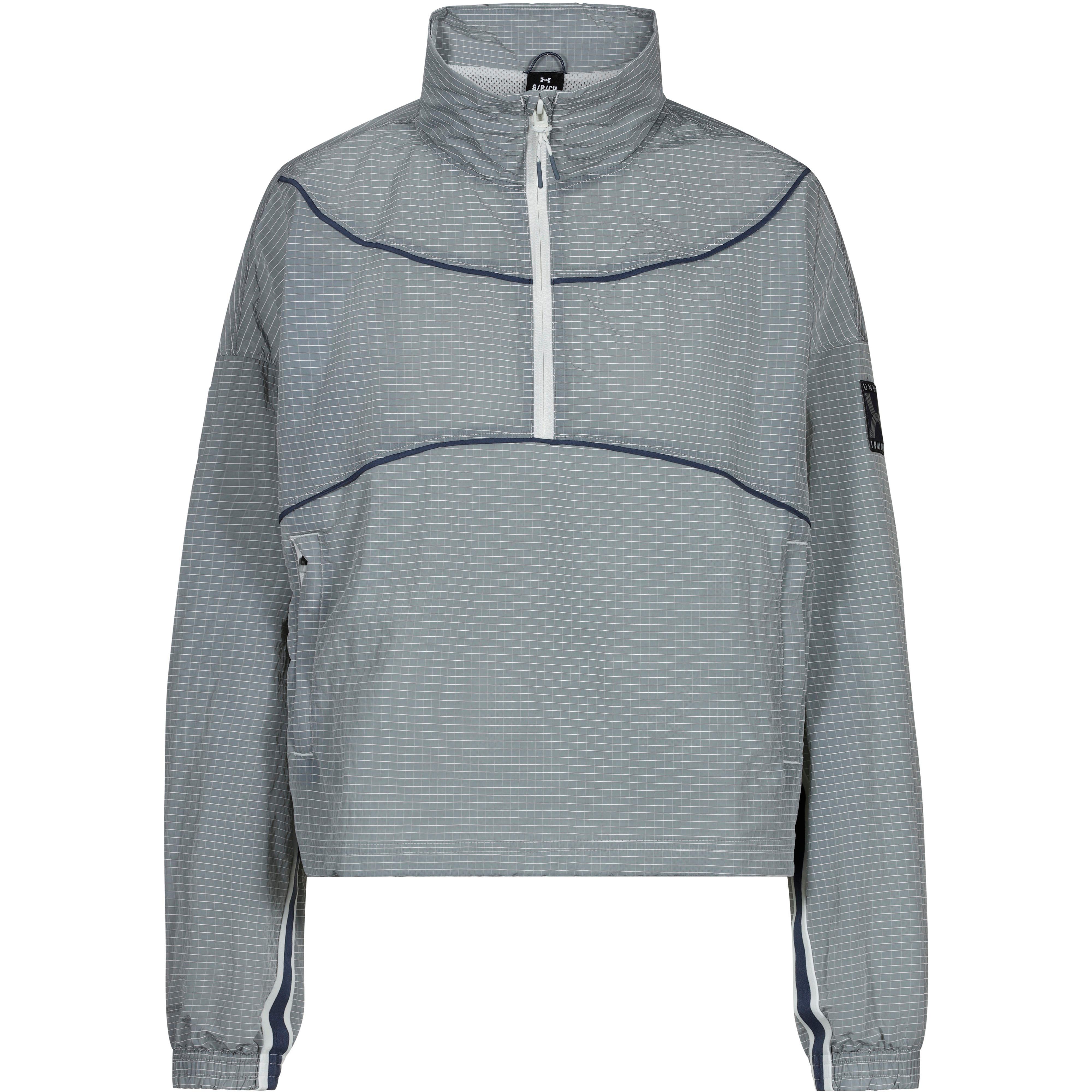 Wasserabweisende Laufjacke mit Karo-Dessin; Stehkragen und Half-Zip mit Kinnschutz; 2 seitliche Reißverschlusstaschen; Rückseite mit großem Labelprint und Belüftungsschlitz; elastische Ärmelbündchen; Saum mit Kordelzug und Stopper verstellbar; Innenseite mit atmungsaktivem Mesh; Material 100% Polyamid.