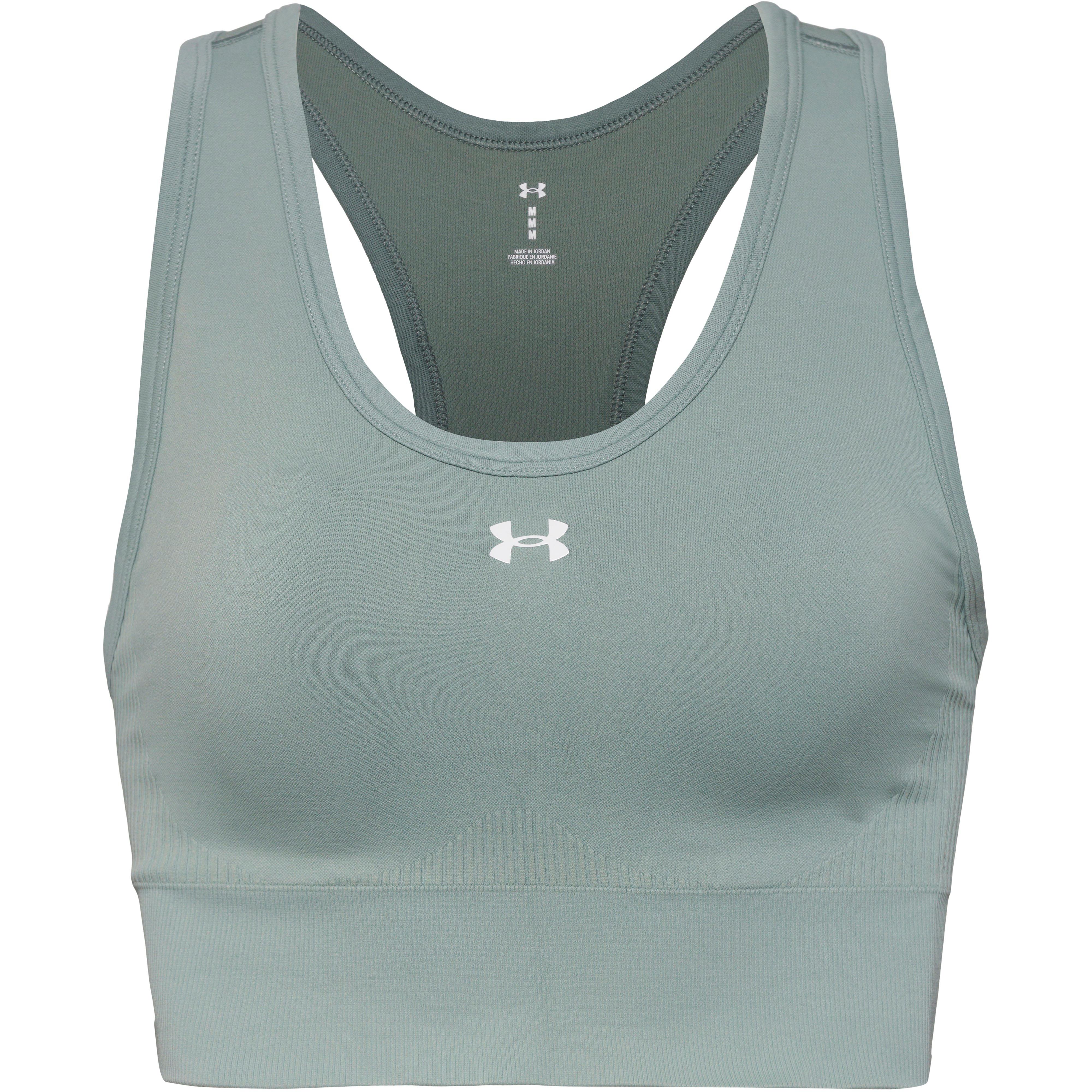 Sport-BH für Aktivitäten mit mittlerer Belastung; etwas länger geschnittene, nahtlose Passform aus weichem Strickmaterial; schnelltrocknend und feuchtigkeitsregulierend sowie elastisch; mit geruchsneutralisierender Technologie; strategisch platzierte, atmungsaktive Einsätze; U-Ausschnitt; herausnehmbare Pads; sportiver Ringerrücken; Material 88% Polyester, 12% Elastan.