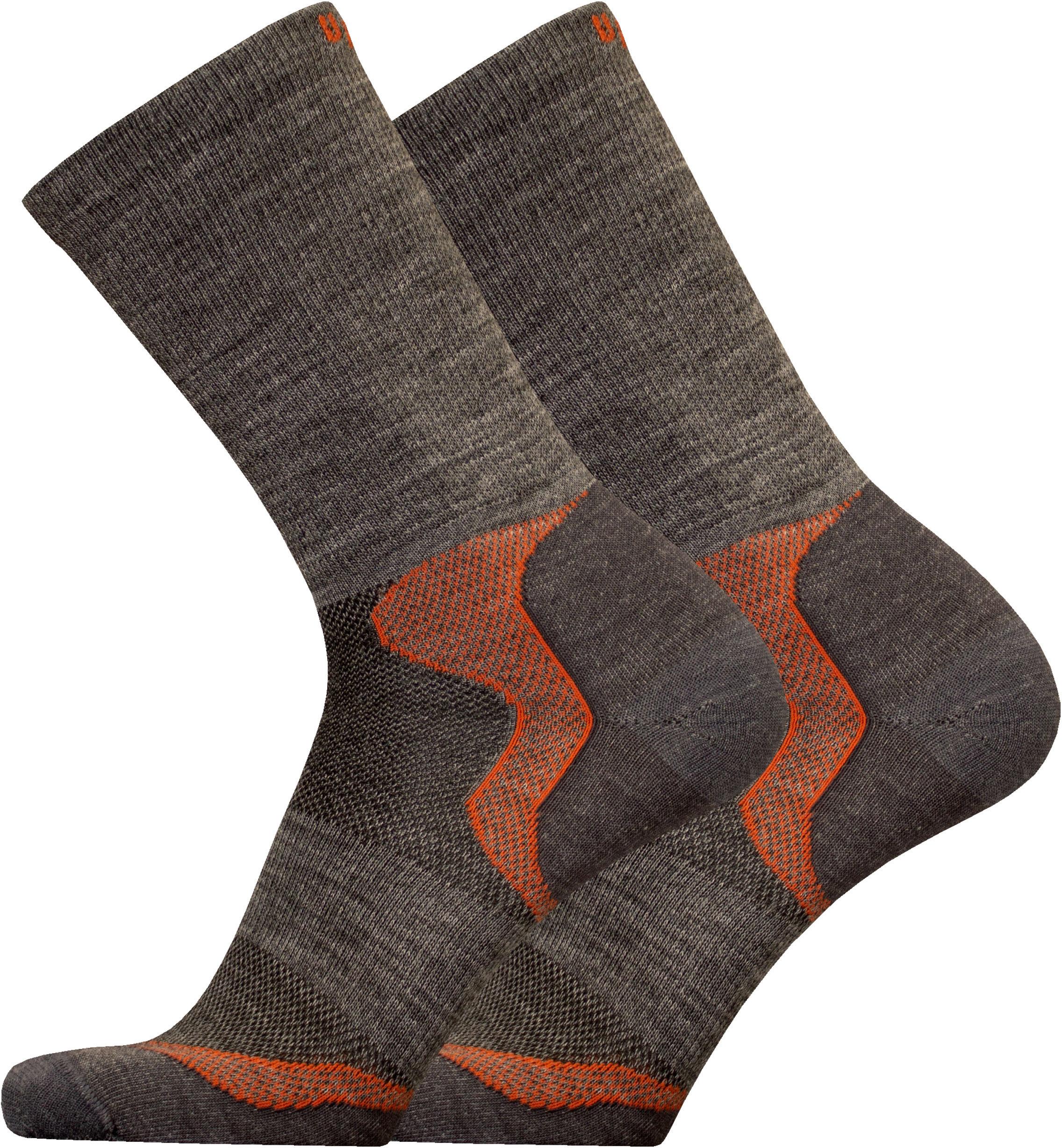 1 Paar leichte Wandersocken in wadenhoher Konstruktion; aus dünnen und elastischen Materialien; nahtloser Zehenbereich; Y-geformte Ferse für eine angenehme Passform; Fersen- und Zehenpolsterung; mit Merinowolle; atmungsaktiv; wärmend; schnelltrocknend; natürlich geruchshemmend; zertifiziert nach Standard 100 by OEKO-TEX®; Made in Finnland; Material 50% Wolle (Merinowolle), 48% Polyamid, 2% Elastan.