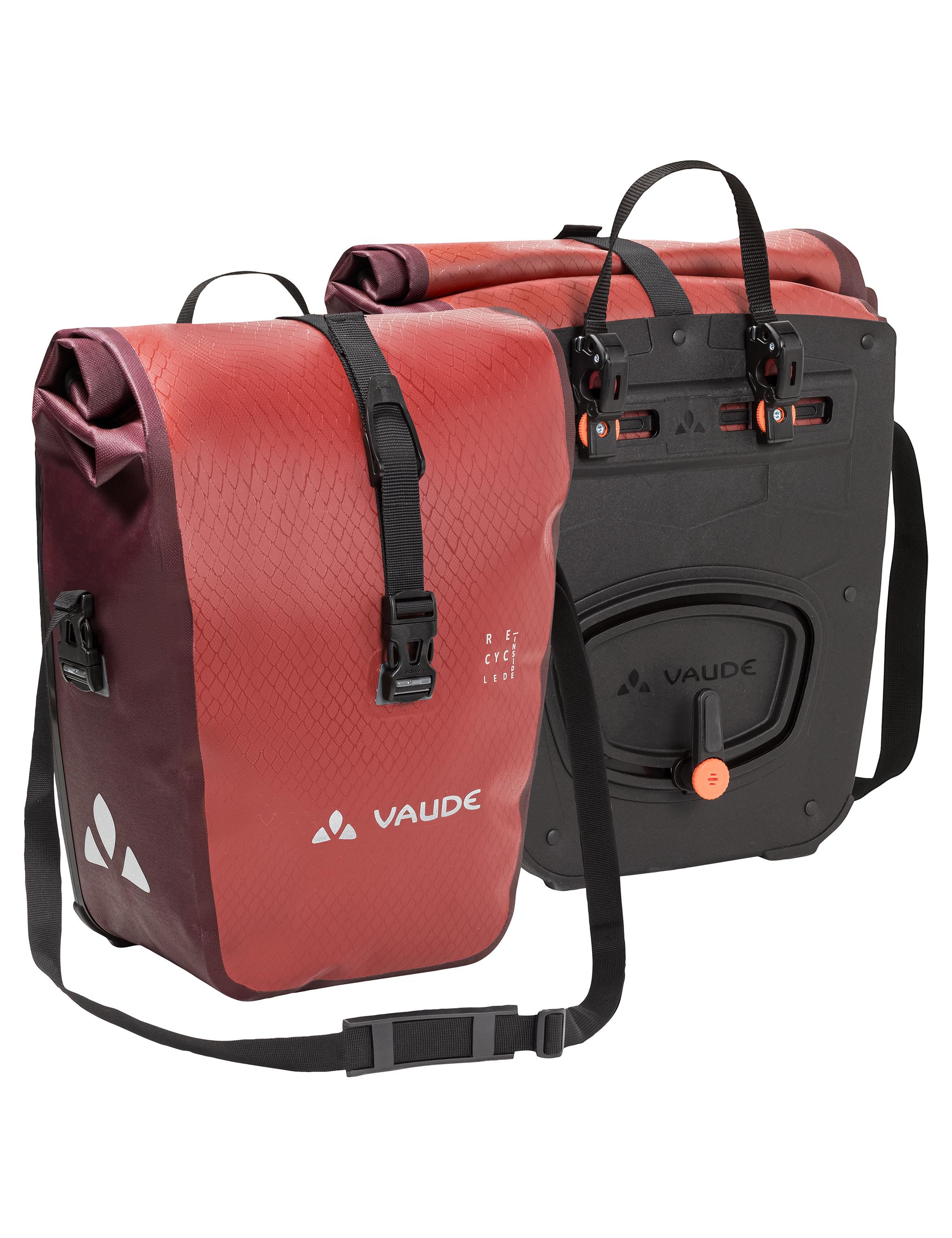 Die wasserdichten Vorderradtaschen werden aus recycelten Materialien am deutschen VAUDE Standort in der Nähe des Bodensees hergestellt. Sie lassen sich durch den Wickelverschluss auf die benötigte Größe komprimieren und absolut dicht verschließen. Für sichere Aufbewahrung von Kleinteilen oder Dokumenten sorgt eine integrierte Organizer-Innentasche mit Reißverschluss. Die Vorderradtaschen sind mit einer stabilen Rückenplatte ausgestattet und werden mit dem QMR 2.0-System stabil am Vorderrad-Gepäckträger befestigt. Die Haken sind über einfach bedienbare Handrädchen justierbar. Mit einem kleinen Bügelschloss (z. B. TSA-Schloss II) können sie direkt am QMR-Haken verriegelt werden. Die mit Reflexelementen bedruckten Vorderradtaschen können genauso gut als Hinterradtaschen oder für Jugendfahrräder verwendet werden. Lieferumfang: zwei Taschen (Paar). Das Gesamtvolumen beider Taschen beträgt 28 Liter, wobei sie durch diese praktische Zubehör-Tasche ergänzt werden können: die Addita Bag. Der praktische, abnehmbare Tragegurt ermöglicht ein bequemes Tragen über der Schulter. Die Taschen sind mit Eco Finish umweltfreundlich wasserabweisend ohne Fluorcarbone (PFC) ausgerüstet. Das VAUDE Green Shape-Label steht für ein umweltfreundliches, funktionelles Produkt aus nachhaltigen Materialien.