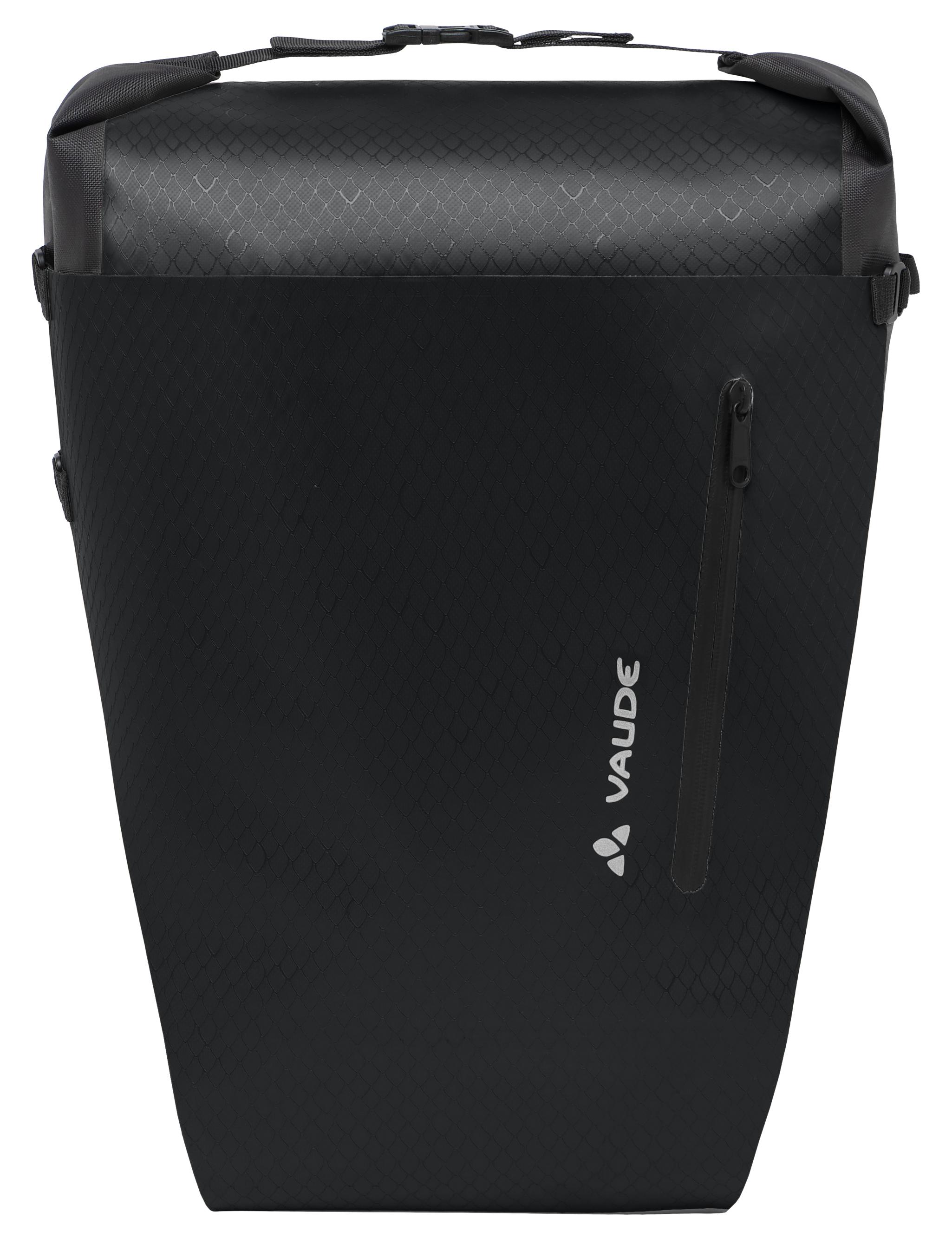 Innovative, 100 Prozent wasserdichte 2in1 Rucksack-Fahrradtasche Made in Germany in geradlinigem, zeitlosen Design fürs Pendeln oder Touren. Der mit 27 Litern sehr geräumige Rolltop Rucksack kommt mit gepolstertem Rücken, ergonomischen Schulterträgern und Brustgurt und lässt sich im Handumdrehen in eine Fahrrad Gepäckträgertasche verwandeln. Die Schulterträger werden in einer Netztasche am Rucksackrücken verstaut und mit der umlegbaren Frontabdeckung gesichert. Diese verfügt über eine Einschubtasche mit wasserdichtem Reißverschluss und ist zum Säubern komplett abnehmbar. Dank des bewährten QMR 2.0 Befestigungssystems wird die 2in1 Rucksack-Fahrradtasche sicher am Gepäckträger (mit runden Rohren von 8 bis max. 16 mm) angebracht und lässt sich auf Zug am Band, das die zwei Haken verbindet, rasch wieder lösen. Die QMR-Haken sind mit einem kleinen Bügelschloss (z. B. TSA-Schloss, nicht im Lieferumfang enthalten) abschließbar. Die Rucksack-Radtaschen-Kombination bietet viel Stauraum mit einem durchdachten Innenleben: ein polstertes Laptopfach für Geräte bis 13,3“ mit außen liegenden zusätzlichen Einsteckfächern für Smartphone, Stifte & Co. Je nach Beladung kann die 2in1 Rucksack Fahrradtasche in 3 Stufen seitlich komprimiert werden. Das robuste Taschen-Material in textiler Optik wird in der VAUDE Manufaktur wasserdicht verschweißt und ist komplett PVC-frei. Mit reflektierenden Logos.