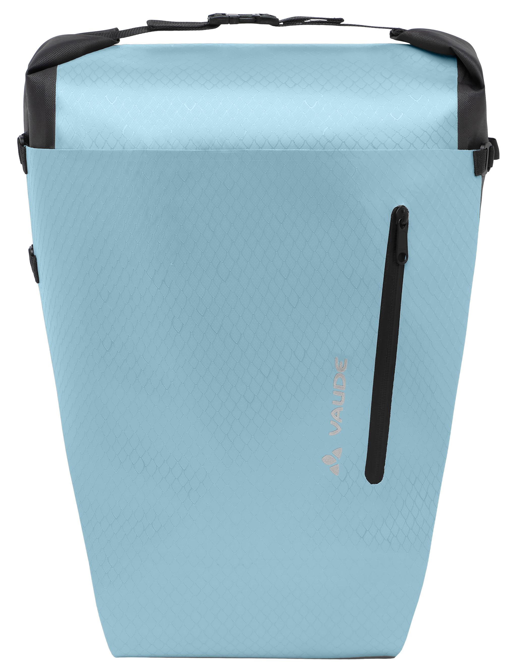 Innovative, 100 Prozent wasserdichte 2in1 Rucksack-Fahrradtasche Made in Germany in geradlinigem, zeitlosen Design fürs Pendeln oder Touren. Der mit 27 Litern sehr geräumige Rolltop Rucksack kommt mit gepolstertem Rücken, ergonomischen Schulterträgern und Brustgurt und lässt sich im Handumdrehen in eine Fahrrad Gepäckträgertasche verwandeln. Die Schulterträger werden in einer Netztasche am Rucksackrücken verstaut und mit der umlegbaren Frontabdeckung gesichert. Diese verfügt über eine Einschubtasche mit wasserdichtem Reißverschluss und ist zum Säubern komplett abnehmbar. Dank des bewährten QMR 2.0 Befestigungssystems wird die 2in1 Rucksack-Fahrradtasche sicher am Gepäckträger (mit runden Rohren von 8 bis max. 16 mm) angebracht und lässt sich auf Zug am Band, das die zwei Haken verbindet, rasch wieder lösen. Die QMR-Haken sind mit einem kleinen Bügelschloss (z. B. TSA-Schloss, nicht im Lieferumfang enthalten) abschließbar. Die Rucksack-Radtaschen-Kombination bietet viel Stauraum mit einem durchdachten Innenleben: ein polstertes Laptopfach für Geräte bis 13,3“ mit außen liegenden zusätzlichen Einsteckfächern für Smartphone, Stifte & Co. Je nach Beladung kann die 2in1 Rucksack Fahrradtasche in 3 Stufen seitlich komprimiert werden. Das robuste Taschen-Material in textiler Optik wird in der VAUDE Manufaktur wasserdicht verschweißt und ist komplett PVC-frei. Mit reflektierenden Logos.