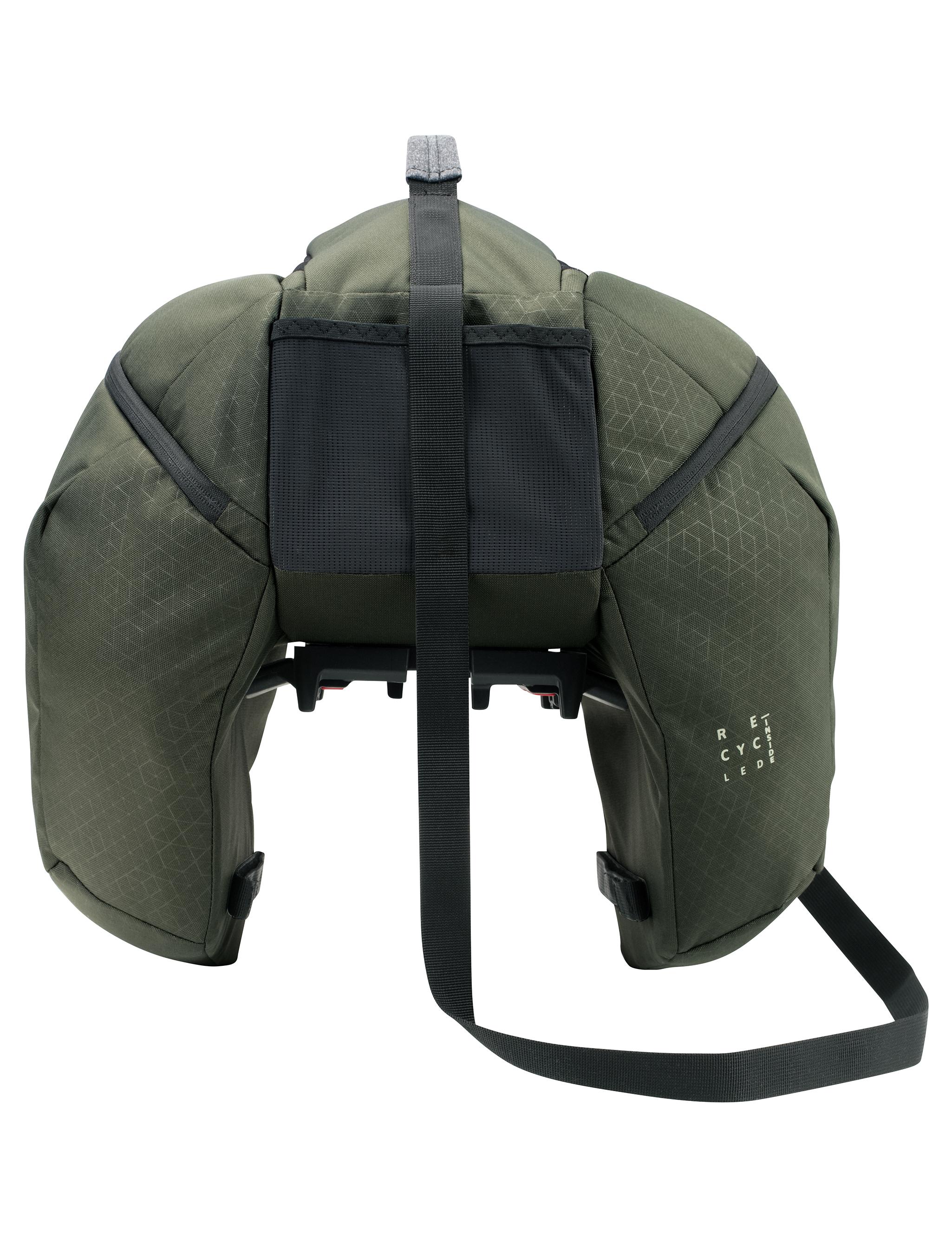 Die eSilkroad Plus Gepäckträgertasche aus recyceltem Polyester vereint ein robustes, sicheres UniKlip-Befestigungssystem mit einer Fächeraufteilung, die sowohl für E- als auch Bio-Biker*innen hervorragend geeignet ist. Mit 27 l Volumen fasst die Satteltasche alles, was für längere Ausflüge mit dem E-Bike gebraucht wird. Das mittlere, mit Reißverschluss gesicherte Hauptfach lässt sich mittels zweier herausnehmbarer Kletteinheiten zur besseren Organisation von Lunchbox und Geldbeutel individuell unterteilen. Die beiden weit öffnenden Seitentaschen mit innenliegenden Netzfächern schlucken Wechselwäsche und selbst ein kleines Wochenendgepäck mit Schlafsack, Waschbeutel & Co. Ein außenliegender Flaschenhalter, ein abnehmbarer Schulterträger, die Befestigung für ein Rücklicht, reflektierende Elemente und eine Regenhülle runden die Ausstattung der eSilkroad Plus Gepäckträgertasche ab. Die Tasche ist mit Eco Finish umweltfreundlich wasserabweisend ohne Fluorcarbone (PFC) ausgerüstet. Das VAUDE Green Shape-Label steht für ein umweltfreundliches, funktionelles Produkt aus nachhaltigen Materialien.