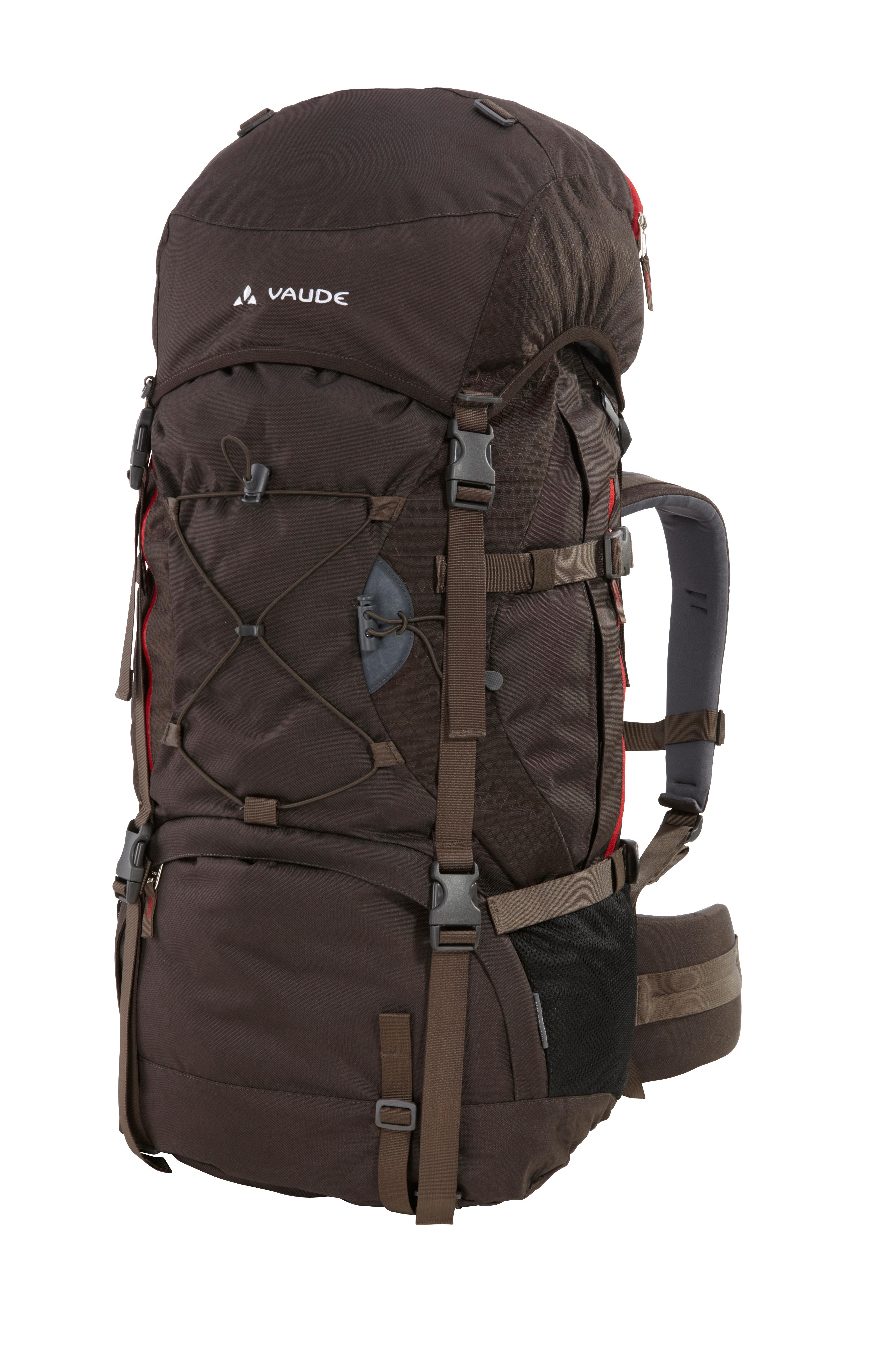 VAUDE KHUMBU 55. Trekkingrucksack. Damenmodell mit spezifischem Tragesystem und kürzerer Rückenlänge. Meshpanels am Rücken sorgen für Belüftung an den Auflagepunkten, gepolsterte Träger und ergonomisch geformter, dick gepolsterter Hüftgurt mit Pull-Forward-Verschluss für ausgezeichneten Tragekomfort; Features: höhenverstellbarer, abnehmbarer Deckel mit Innen- und Außenfach, und integrierter Regenhülle; 2-Kammer-Packsack mit austrennbarem Zwischenboden; Trinkblasen-Aufnahme und Schlauchausgang; großes RV-Vorfach mit aufgesetzter regulierbarer Gummizughalterung; 2 RV-Seitentaschen + 2 große Mesh-Seitentaschen; Stockhalterung; verstellbare Befestigungsriemen am Boden und unter dem Deckel; Kompressionsriemen; Material: PU-beschichtetes Polyester und Ripstop-Polyamid; Volumen ca. 55 l. Höhe ca. 72 cm. Gewicht ca. 2.400 g.