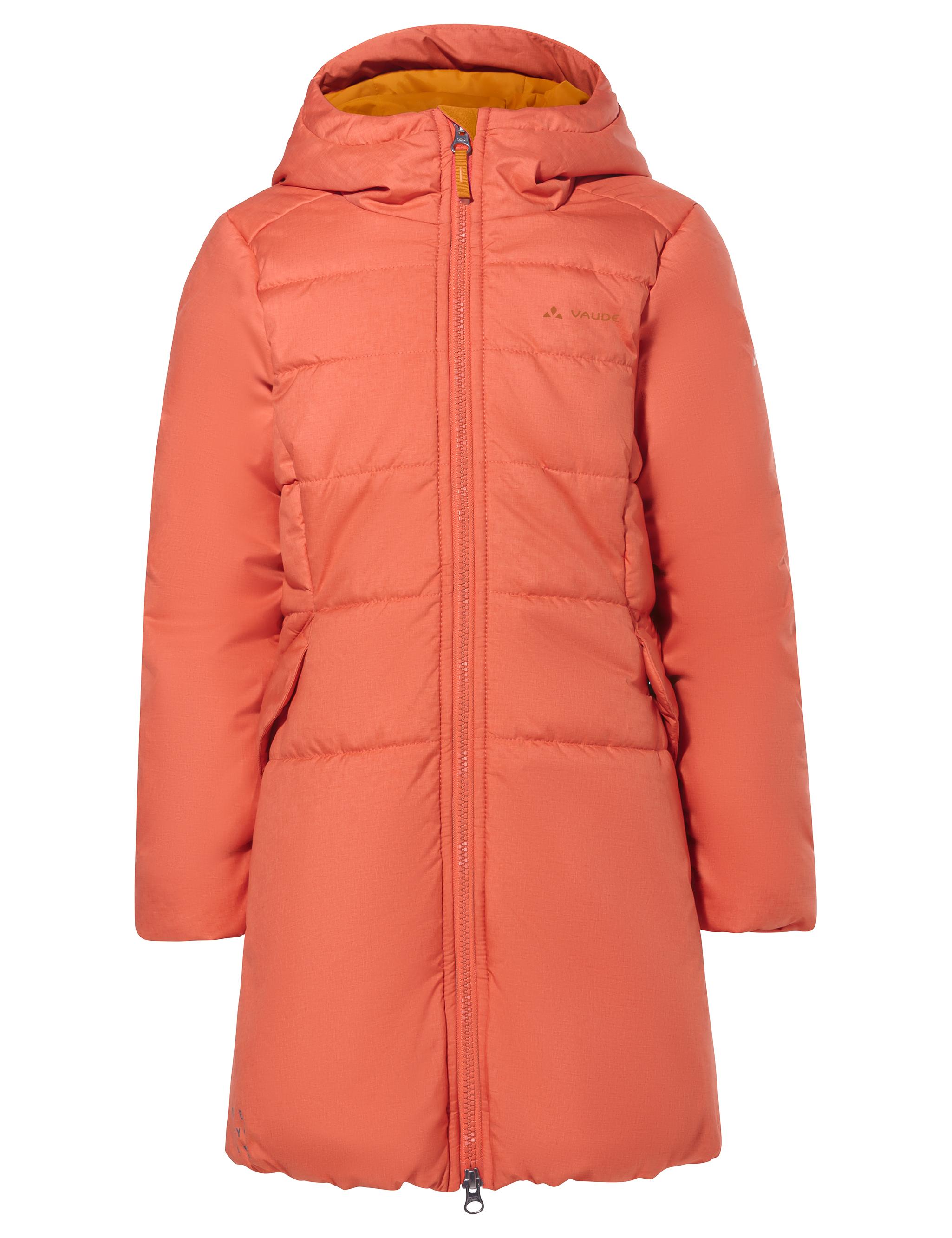 Warm wattierter Wintermantel für mode- und umweltbewusste Mädchen! Der bauschige, umweltfreundliche Wintermantel mit leichtem Melange-Effekt und einer modischen Ballon-Silhouette trotzt knackigen Minustemperaturen und Schneebällen. Der Wintermantel für Mädchen ist mit Eco Finish umweltfreundlich wasser- und schmutzabweisend ohne Fluorcarbone (PFC) ausgerüstet. Die warme Kapuze schützt vor kaltem Wind und die großen Druckknopf-Eingrifftaschen halten die Finger schön warm. In den Ärmeln sind weiche Gummis eingearbeitet, damit die Kälte draußen bleibt. Der verdeckte Front-Reißverschluss des Wintermantels für Mädchen hält steife Brisen zusätzlich ab. Die funktionelle VAUDE Kinderbekleidung zeichnet sich durch hochwertige Materialien, kindgerechte Passformen und Farben sowie eine umweltfreundliche Herstellung aus. Wir entwickeln durchdachte Kinder-Outdoorbekleidung, die sich durch ihre Langlebigkeit auch von Kind zu Kind weitervererben lässt. Das VAUDE Green Shape-Label steht für ein umweltfreundliches, funktionelles Produkt aus nachhaltigen und bluesign® zertifizierten Materialien.