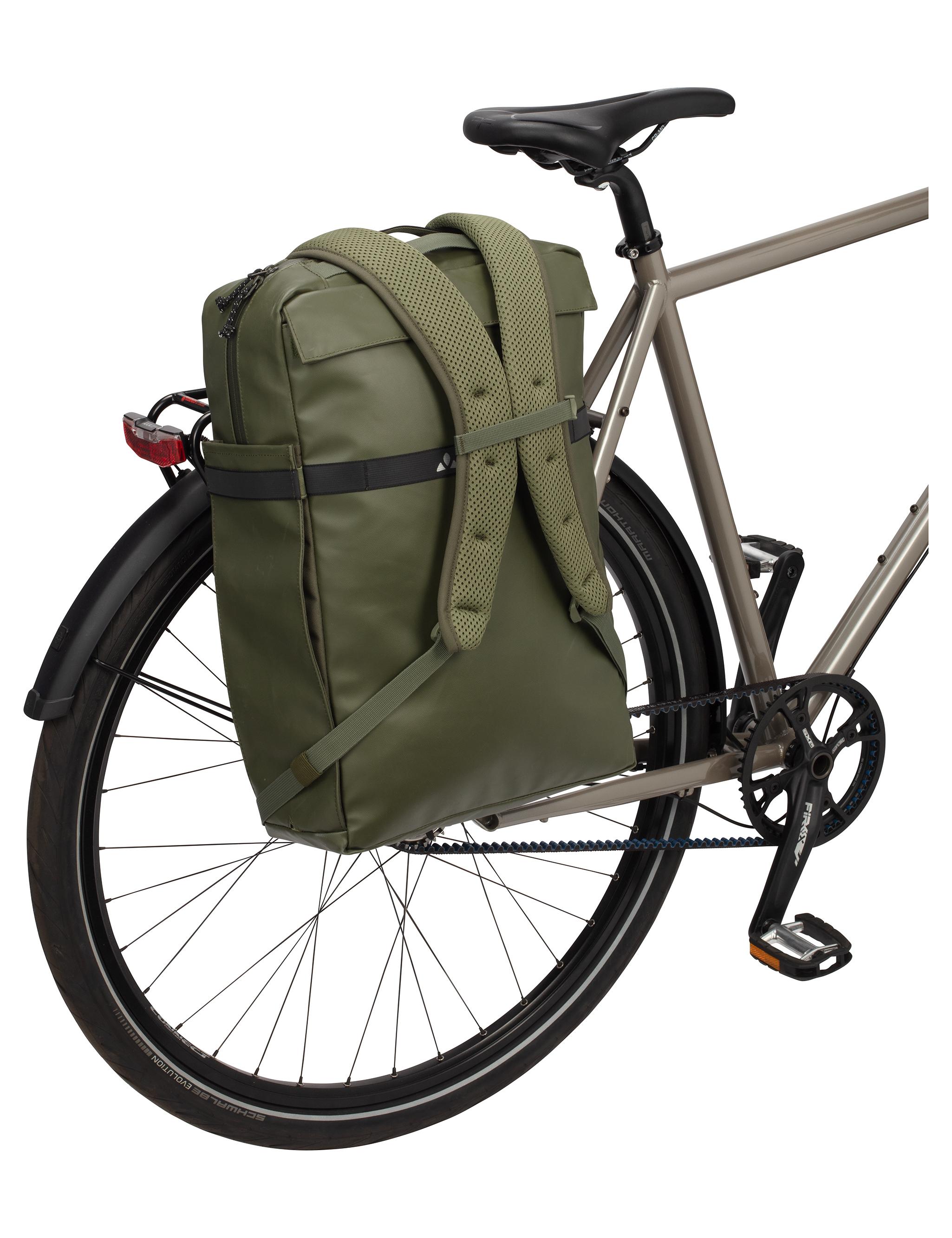Hast du den, hast du alles - denn der umweltfreundliche, PVC-freie Mineo Transformer Backpack 20 kann als Fahrradtasche an den Gepäckträger angeklippt werden, er dient zugleich als komfortabler Business-Rucksack und hat obendrein noch eine Trolley-Aufsteckfunktion für deine Reisezeiten. Über die verstellbare Plug and Ride-Befestigungsschiene wird der Fahrradrucksack am Gepäckträger montiert und abgenommen, was ruckzuck von der Hand geht. Die Schiene verschwindet dann einfach im Schnellverstaufach, wenn der Fahrradrucksack aufgesetzt wird. Im großzügigen Hauptfach befindet sich ein Einsteckfach für einen 15,6" Laptop sowie eine Stifte- und Getränkeflaschen-Halterung. Ein weiteres Frontfach und ein Sicherheitsfach auf der Rückseite halten Handy, Dokumente und Unterlagen im Fahrradrucksack schnell griffbereit. Ein superpraktisches Schlüsselhalter-Gummiband am gepolsterten Schulterträger macht das Türaufschließen zum Vergnügen und das schmutzabweisende Material ist unempfindlich gegen den alltäglichen Großstadtdschungel. Als Mitglied mit Leader Status bei der unabhängigen Organisation Fair Wear engagiert sich VAUDE für faire Arbeitsbedingungen und faire Löhne. Das VAUDE Green Shape-Label steht für ein umweltfreundliches, funktionelles Produkt aus nachhaltigen Materialien.