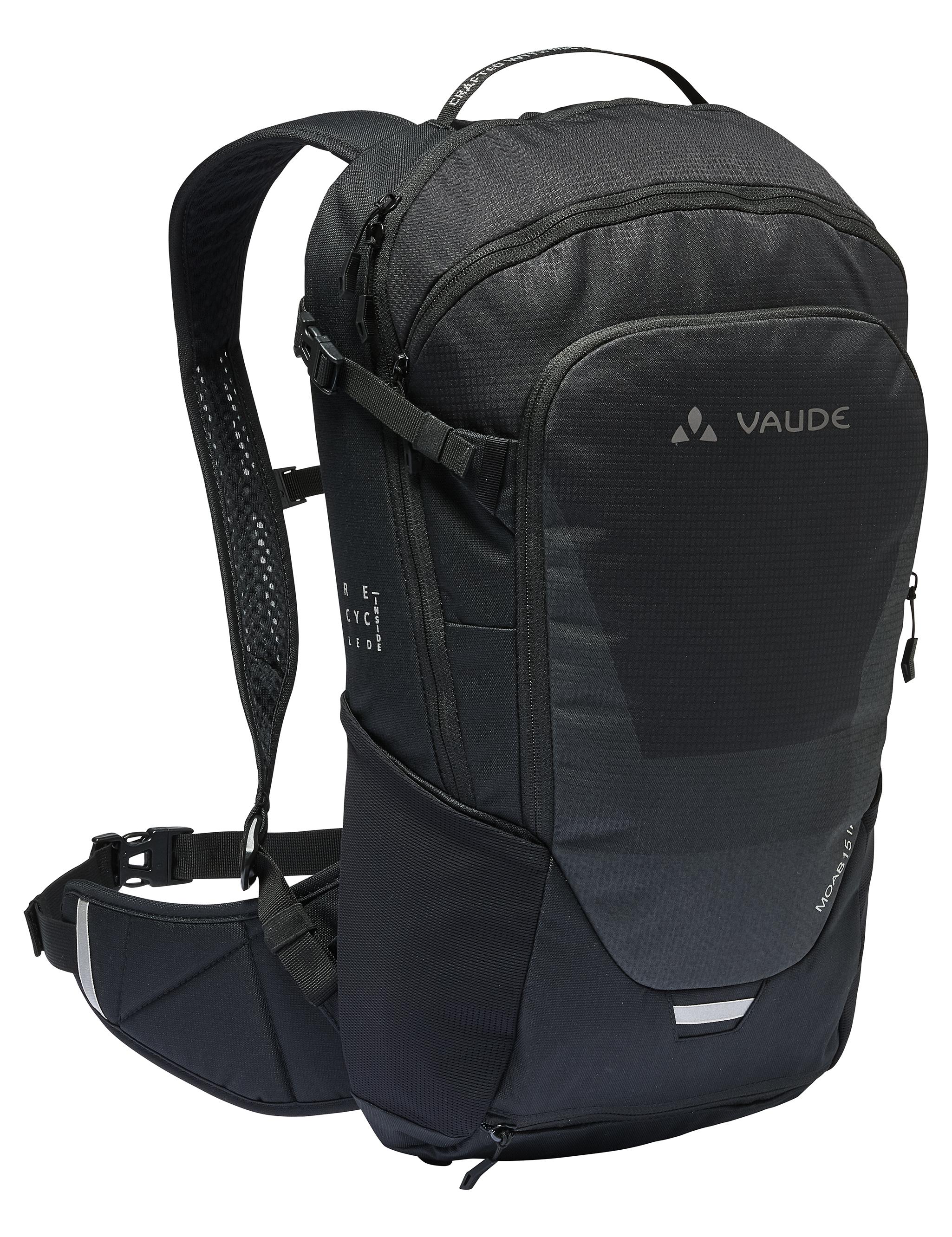 Die Evolution unseres erfolgreichen Modelles Bracket garantiert komfortables Trailriding! Mit dem umfangreich ausgestatteten 15 Liter Rucksack gibt es keine Organisationsprobleme mehr. Für perfekten Sitz und gute Belüftung sorgt das optimierte Ventex Active Rückensystem, dass durch stärkere Polsterung im Bereich der Lendenwirbelsäule Druckpunkte deutlicher entlastet. Der komfortable Hüftgurt zieht den Schwerpunkt des Rucksacks perfekt an den Rücken und sorgt in Kombination mit den Ergoshape-Schulterträgern für einen perfekten Sitz mit optimaler Bewegungsfreiheit auf dem Rad. Der Rucksack ist in drei Fächer unterteilt. Vor dem großen Hauptfach für Regenbekleidung und Proviant befindet sich ein Wertsachenfach mit innenliegender Reißverschlusstasche. Das Werkzeugfach auf der Rucksackfront nimmt gut organisiert alles auf, was bei einer Panne schnell und einfach griffbereit sein muss. Der Helmhalter kann ordentlich in der unteren Front verstaut werden kann. Auf dem rechten Hüftgurtflügel bietet eine Tasche ausreichend Platz für Smartphone, Kleingeld oder einen Powerriegel. Zur Ausstattung gehören elastische Seitentaschen, ein separates Trinkblasenfach, Kompressionsriemen im oberen Seitenbereich, ein Loop auf dem Träger für die Sonnenbrille, eine Regenhülle im separaten Bodenfach und Reflexelemente für mehr Sicherheit in der Dunkelheit. Alle Moab Rucksack Modelle harmonieren perfekt mit den stylischen Moab Bekleidungsteilen. Das bluesign®-zertifzierte, recycelte Material des Moab 15 ist mit Eco Finish umweltfreundlich wasserabweisend ohne Fluorcarbone (PFC) hergestellt.