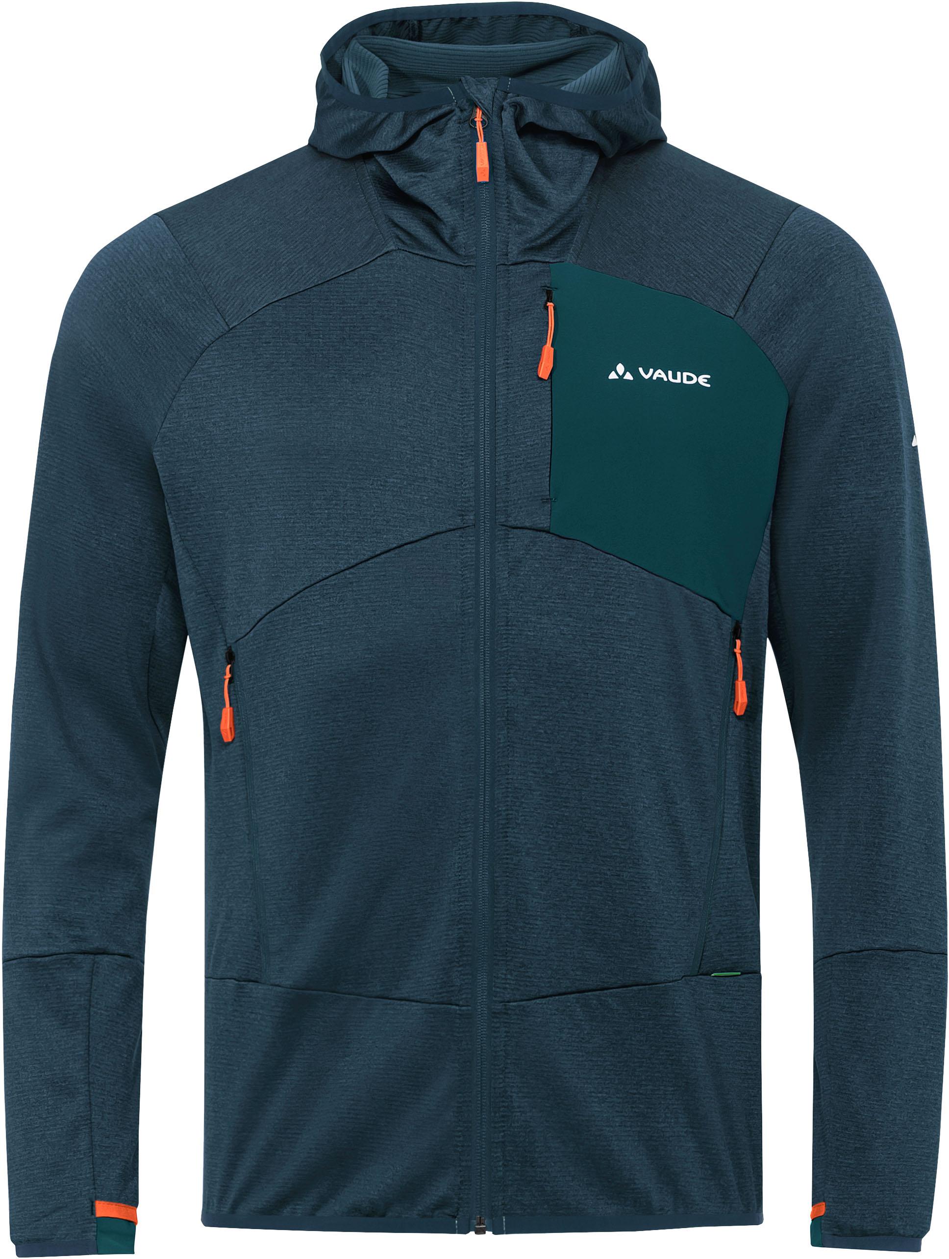 Stretchige Fleecejacke mit fester Kapuze; Kinnschutz am Kragen; durchgehender Frontreißverschluss; 1 Brusttasche mit Reißverschluss; 2 große Reißverschlusstaschen; elastische Abschlüsse; Ärmelabschlüsse mit Daumenschlaufen; normale Passform; Grüner Knopf; Green Shape; enthält Recyclingmaterial; Material 97% Polyester (davon 67% recycelt), 3%Elastan; Material II 100% Polyester.