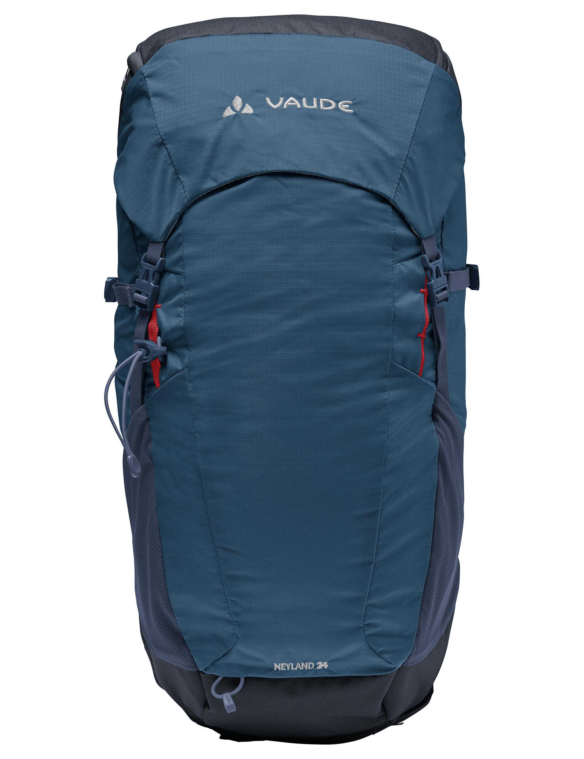 Moderner Wanderrucksack mit Deckelverschluss. Der Neyland 24 eignet sich für kleine Bergtouren und Wandertouren gleichermaßen. Sein innovatives Rückensystem mit den strukturierten Schaumstoffmodulen hinter dem Netz sorgt einerseits für eine gute Belüftung und andererseits für einen stabilen Rückenkontakt, sodass der kleine Rucksack trotz Ventilation flächig und stabil auf dem Rücken aufliegt. Die integrierte EMP Platte (ergonomic movement panel) unterstützt die natürliche Rückenbeugung beim Aufstieg und verhindert gleichzeitig, dass das Gepäck auf den Rücken durchdrücken kann. Ausgestattet ist der kleine Wanderrucksack mit einem Deckelfach, einem geräumigen Hauptfach, einem separaten Trinksystemfach und einem Fach mit Regenhülle. In die seitlichen Stretch-Taschen passen Getränk, Mütze oder andere Kleinutensilien. Wanderstöcke können an der Stockbefestigung befestigt werden und die seitlichen Kompressionsriemen dienen als weitere Gepäckfixierung. Der Neyland 24 wurde aus überwiegend recyceltem Material hergestellt. Das VAUDE Green Shape-Label steht für ein umweltfreundliches, funktionelles Produkt aus nachhaltigen und zertifizierten Materialien.