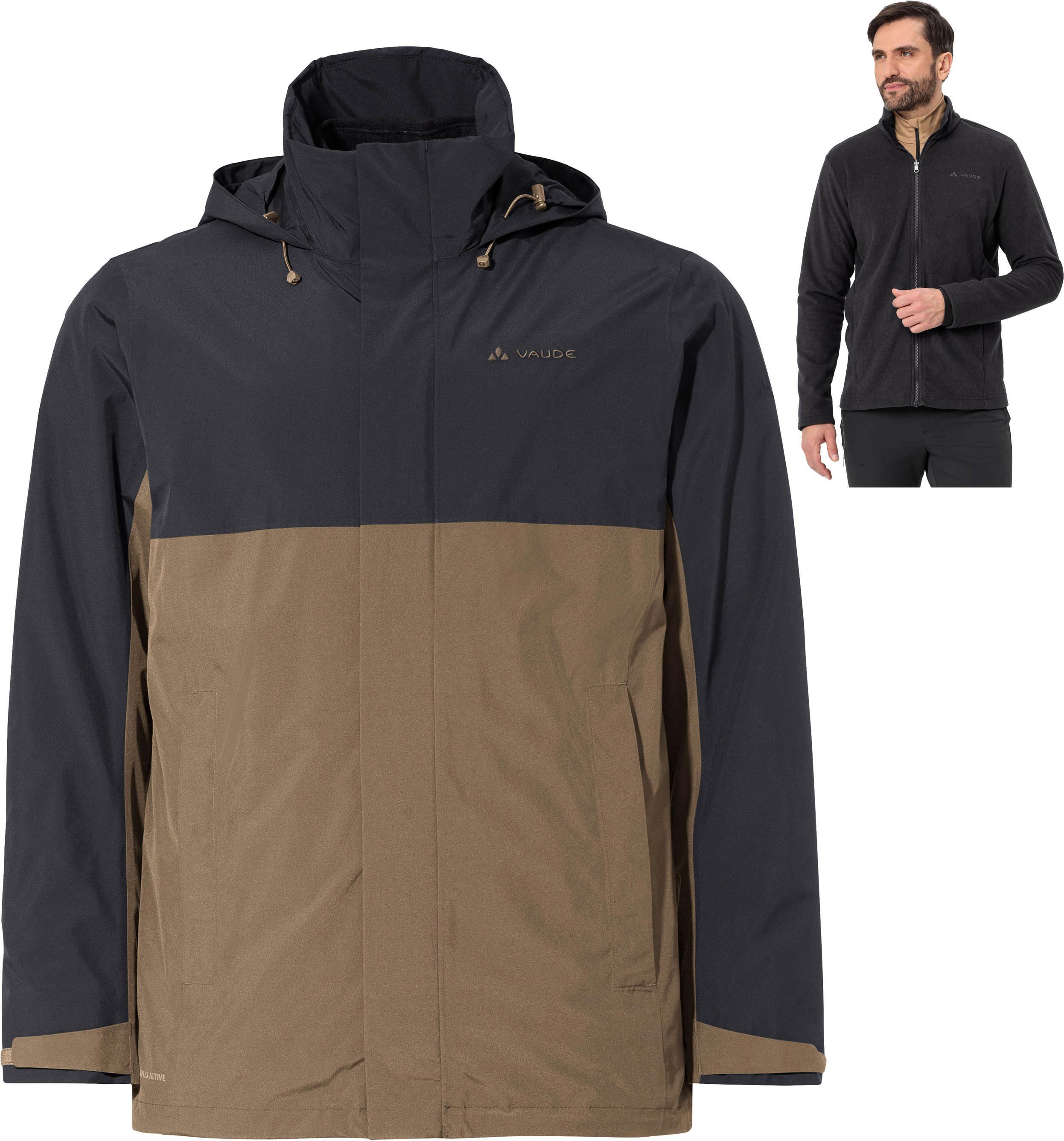 Doppeljacke mit funktioneller 3in1-Funktion; wasser- und winddichte sowie hoch atmungsaktive Außenjacke mit Ceplex Active-Membran und ohne PFC hergestelltem Eco Finish; Wassersäule: 10.000 mm; weitenregulierbare Kapuze, im Kragen verstaubar; Frontreißverschluss mit Windschutzleiste; 2 abgedeckte Seitentaschen mit Reißverschluss; Ärmelbündchen mit Klettriegeln; Kordelzug im Saum durch die Taschen verstellbar; wärmende Innenjacke aus weichem Fleece ohne Seitennähte; Stehkragen; zentraler Reißverschluss; 2 seitliche Eingrifftaschen; Grüner Knopf; Fair Wear; Membran 100% Polyurethan; Obermaterial Außenjacke 100% Polyester; Obermaterial Innenjacke 100% Polyester (62% recycelt); Futter I 100% Polyamid; Futter II 100% Polyester (56% recycelt); Futter III 100% Polyester (recycelt); Futter IV 100% Polyamid (recycelt).
