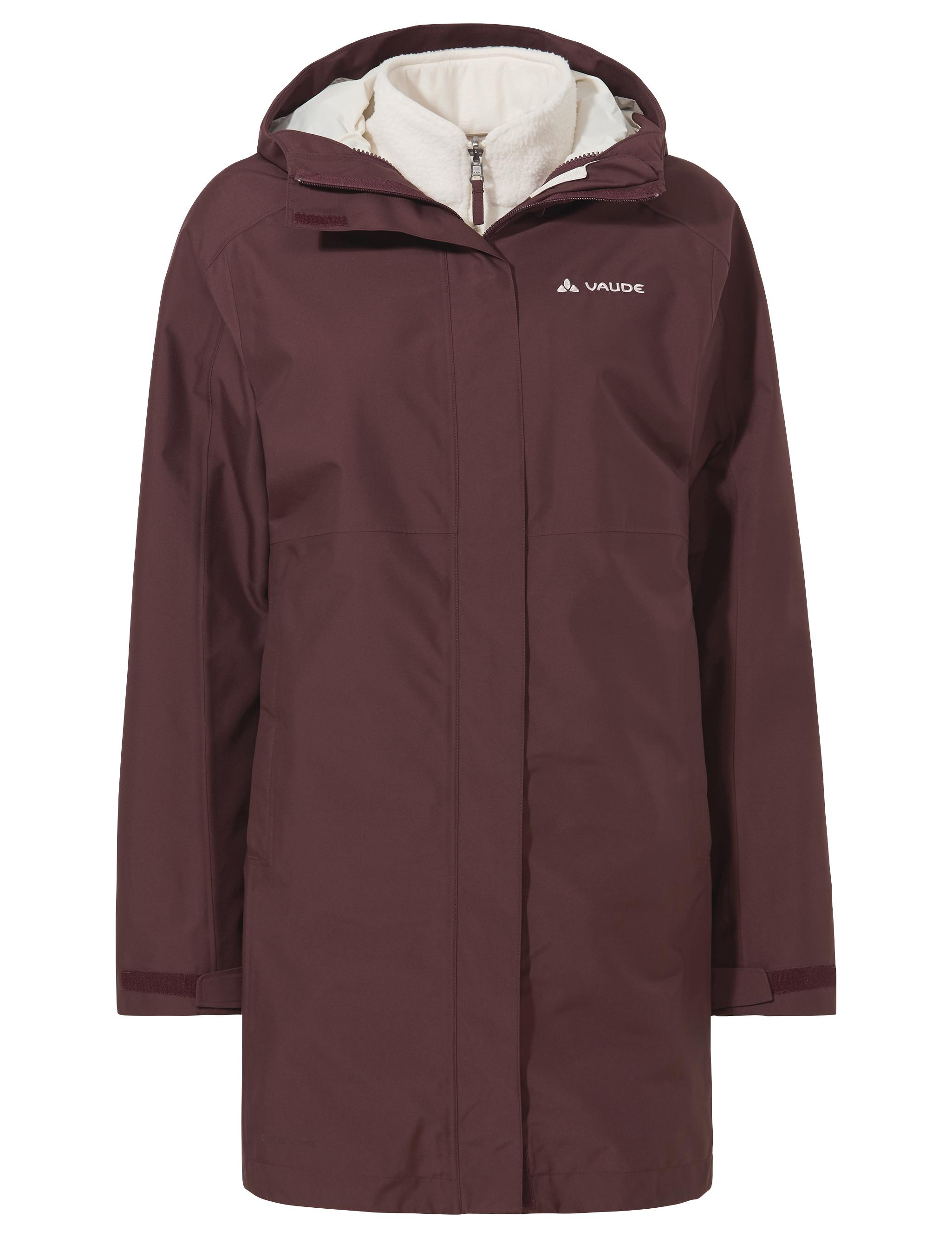 Dieser 3in1 Parka für Damen bietet drei Möglichkeiten. Man kann nur die äußere wasserdichte Jacke tragen und hat eine angeschnittene Kapuze mit Verstellung, die sich im Kragen verstauen lässt, und einen 2-Wege-Reißverschluss vorne. In der äußeren Schicht befinden sich auch die drei Taschen: zwei Reißverschlusstaschen vorne und eine Napoleontasche. Wenn es weder regnet noch windet, kann man aber auch nur die Innenjacke aus Fleece in Parkalänge tragen - oder im Zweifel eben beides. Der Saum und die Ärmelabschlüsse lassen sich bei dem Damen 3in1 Parka in der Weite verstellen, sodass Wind und Regen draußen gehalten werden. Zusätzlich zur wasserdichten Membran ist der Oberstoff mit Eco Finish wasser- und schmutzabweisend ausgerüstet. VAUDE verzichtet dabei auf Fluorcarbone, sogenannte PFAS- beziehungsweise PFC-Chemikalien, die im Verdacht stehen, gesundheitsschädlich zu sein. Das VAUDE Green Shape-Label steht für ein umweltfreundliches, funktionelles Produkt aus nachhaltigen Materialien.