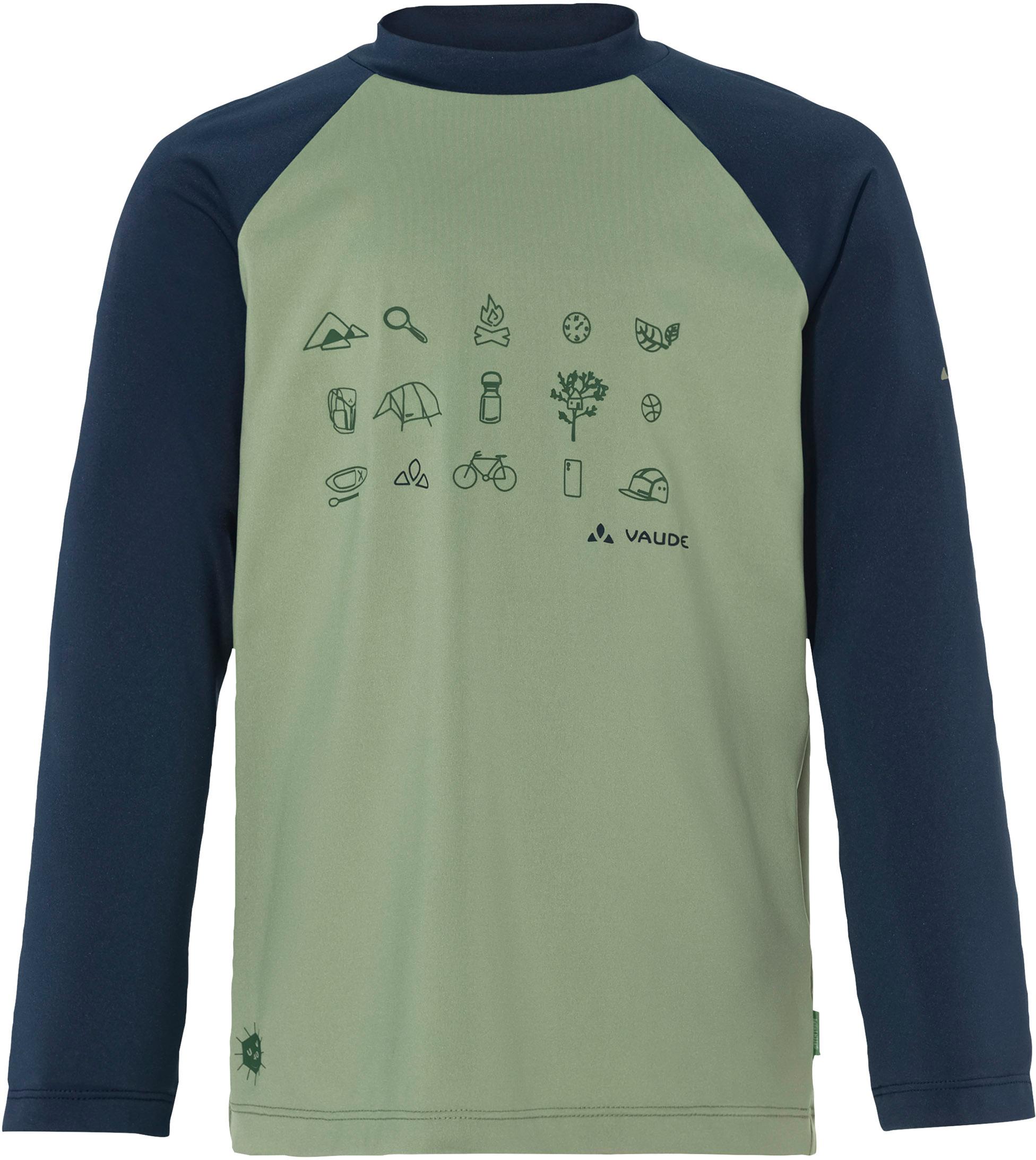 Langärmliges Funktionsshirt in zweifarbigem Design für Kinder und Jugendliche; elastisches Material; schützt vor Sonneneinstrahlung; niedriger Stehkragen; Outdoor-Motivprint auf der Vorderseite; Logodetail; Raglanärmel für optimale Bewegungsfreiheit; normale Passform; vollständig aus Recyclingmaterial hergestellt; zertifiziert mit den Labels Grüner Knopf und Green Shape; Gewicht: ca. 90 g; Material 91% Polyester (recycelt), 9% Elastan (recycelt).
