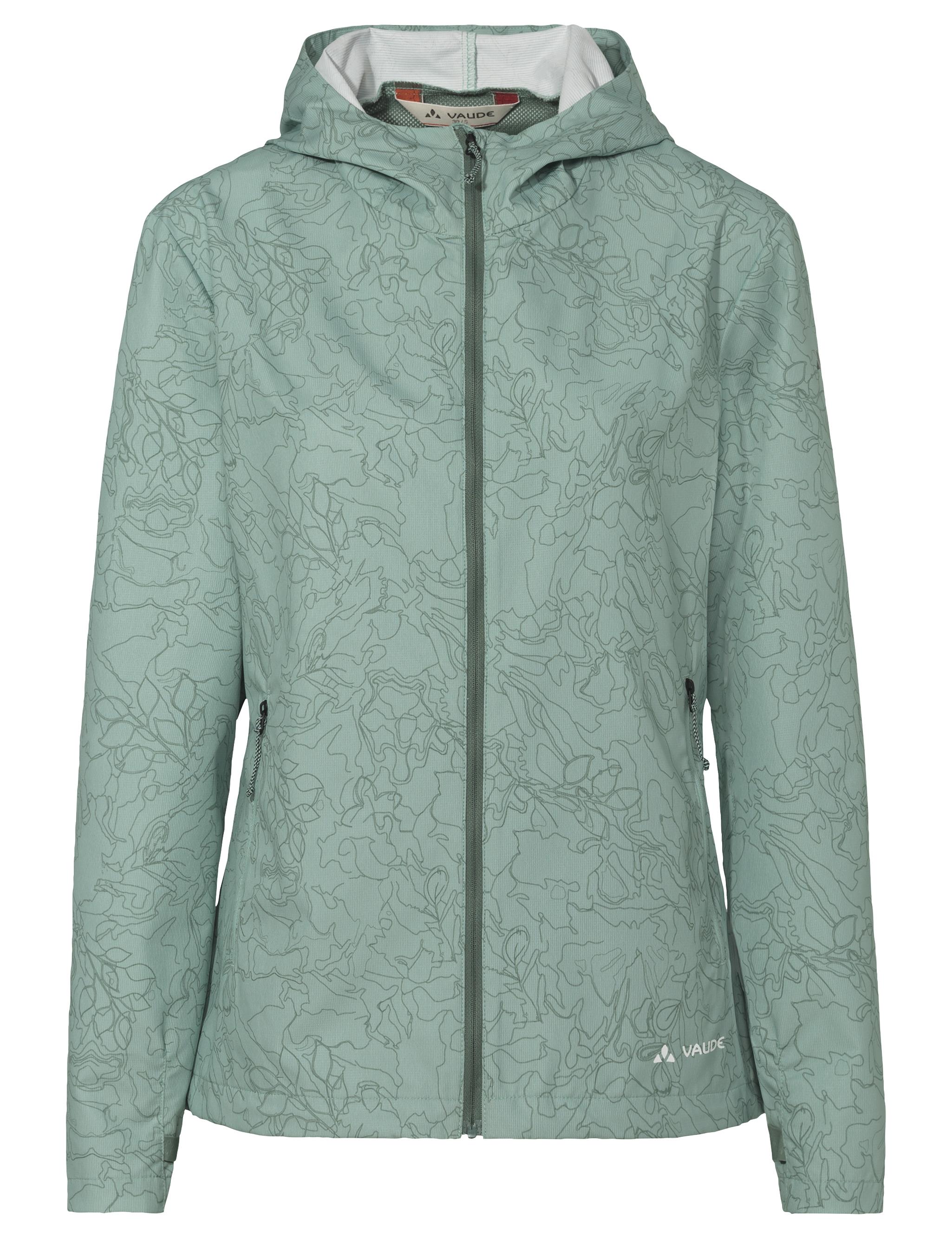 Leichte und stylishe Damen Fahrrad Windjacke für gemütliche Touren bei wärmeren Temperaturen. Für den frühen Start, wenn die Tour in den Abend hineingeht oder wenn es einfach mal windet, ist die Adlux Fahrrad Windjacke für Damen genau das Richtige. Dank des schlichten Designs mit Allover-Print und des lockeren Schnitts fühlt man sich in ihr aber auch beim Café-Stop, Spaziergang oder in der Stadt wohl. Gleichzeitig glänzt die Jacke mit einer hochwertigen Materialauswahl und den integrierten Funktionen, wie der intelligent platzierten Ventilation im Rückenbereich. Saum- und Ärmelabschlüsse können schnell und einfach angepasst werden. Die beiden Fronttaschen mit Reißverschluss bieten Stauraum für Kleinigkeiten wie Schlüssel und Geldbeutel. Wird die Windjacke mal nicht gebraucht, lässt sie sich sehr klein packen und verstauen. Der Oberstoff der Adlux Fahrrad Windjacke für Damen ist mit Eco Finish PFC-frei wasser- und schmutzabweisend ausgerüstet. Das VAUDE Green Shape-Label steht für ein umweltfreundliches, funktionelles Produkt aus nachhaltigen Materialien.