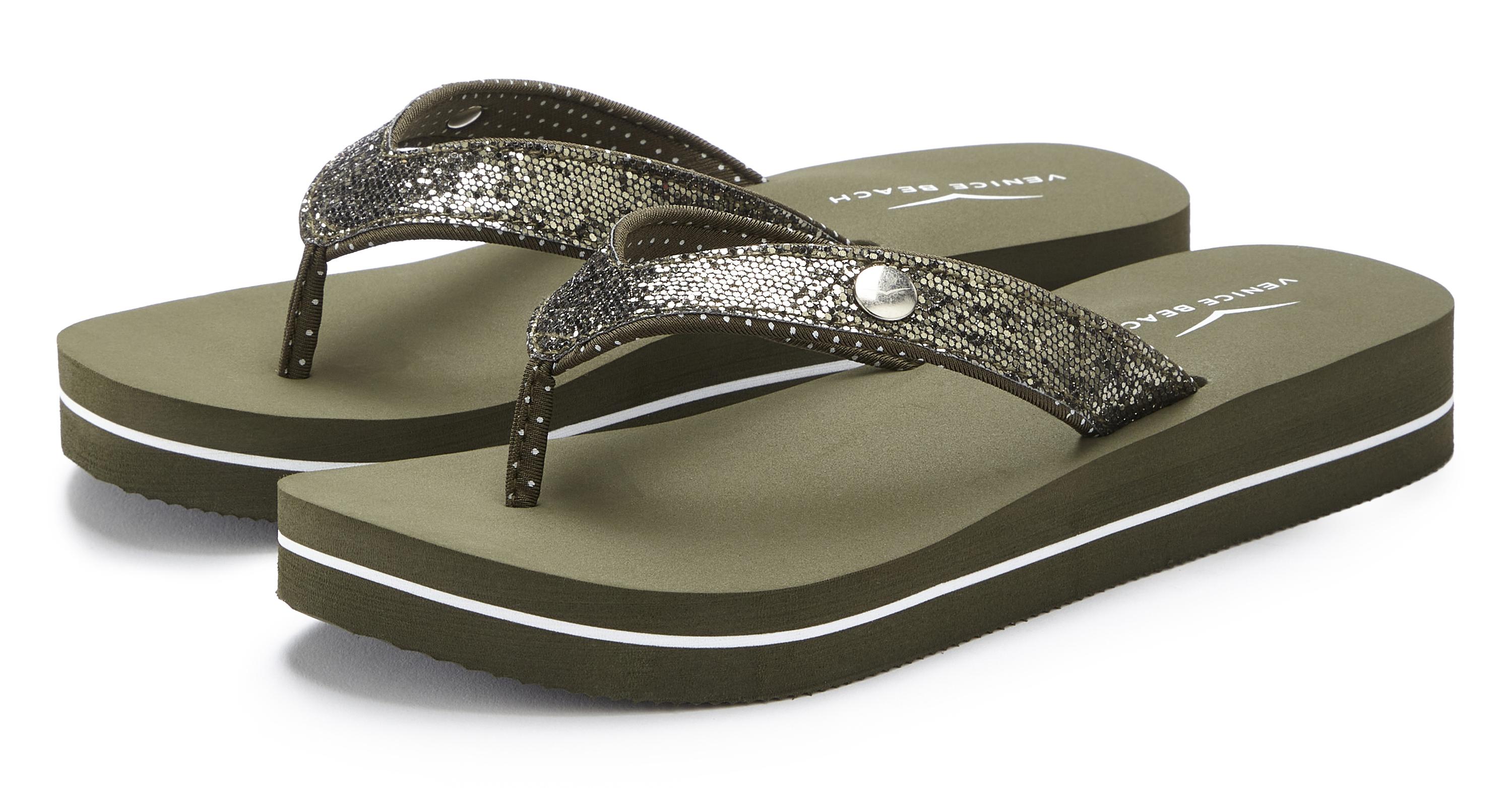 Zehentrenner von VENICE BEACH. Absatzhöhe ca. 3 cm. Obermaterial und Futter aus Lederimitat. Decksohle und Laufsohle aus Synthetik.