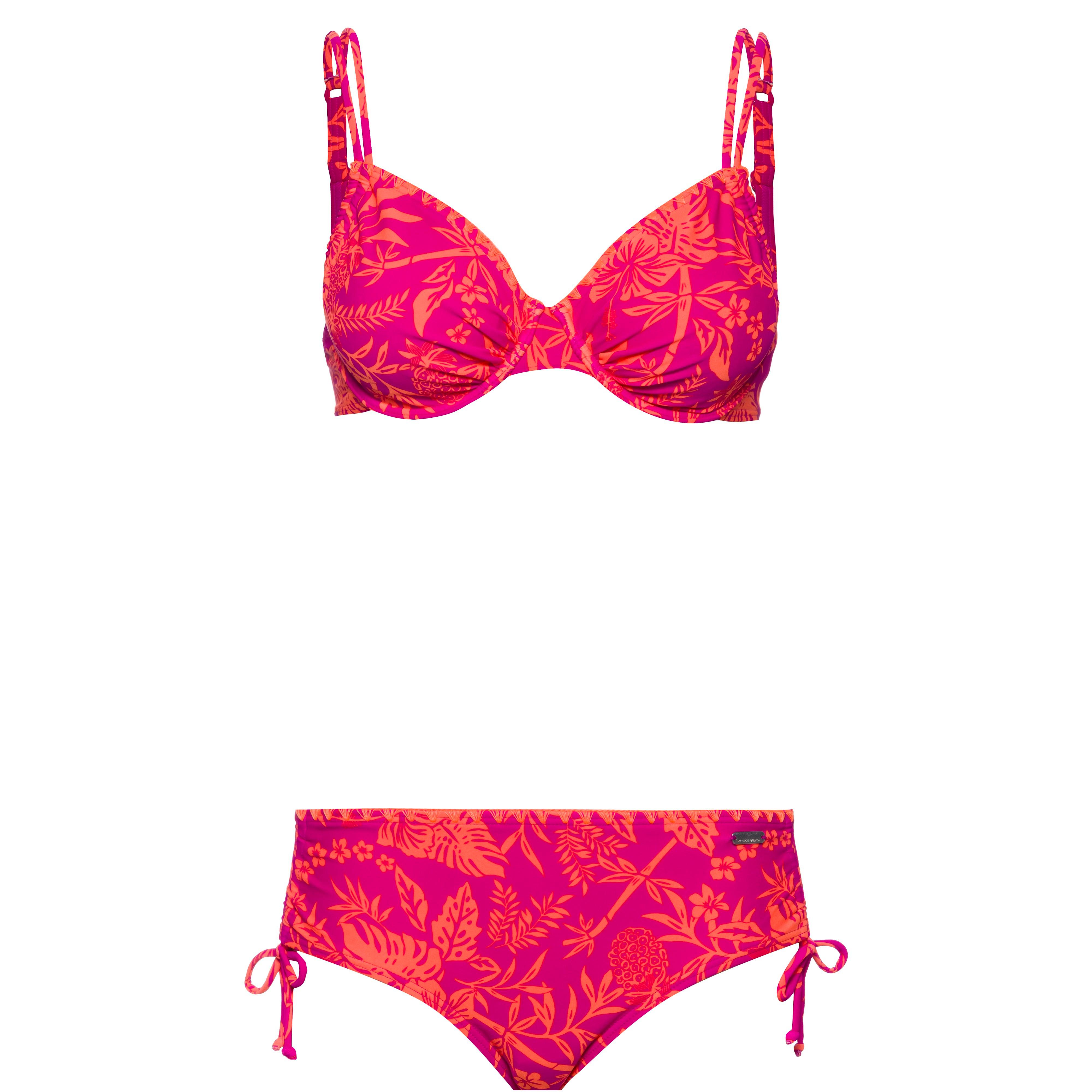 Bikini-Set mit sommerlichem Jungle-Print; elastisches Material; Oberteil mit verstellbaren Spaghettiträgern und Verschluss am Rücken; Cups mit Bügeln und herausnehmbaren Polstern; Slip mit etwas höherem Bund und Schnürdetails an den Seiten; metallisch glänzendes Labeldetail am Bund; Obermaterial 80% Polyamid, 20% Elastan; Futter 100% Polyester.