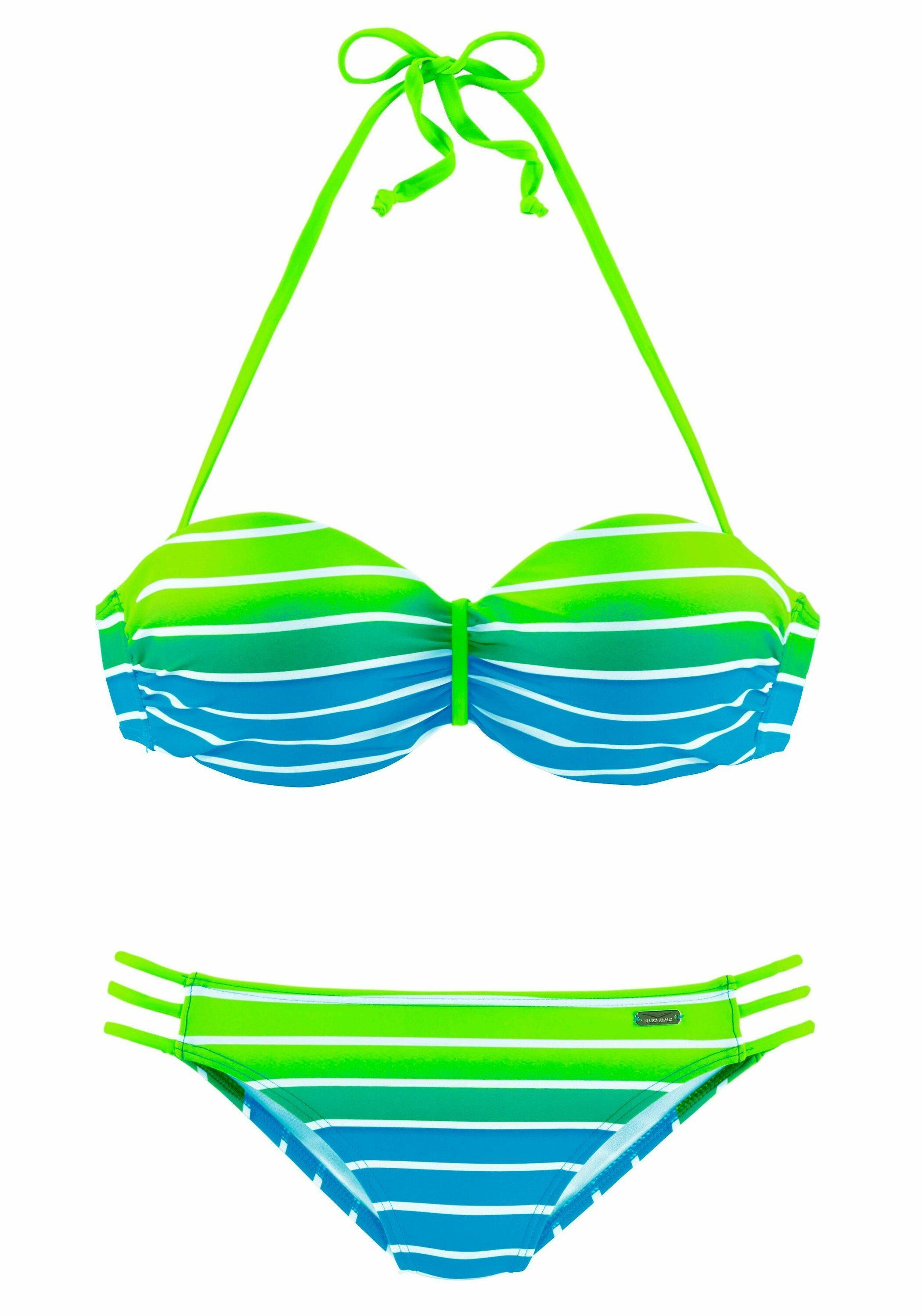 Bikini mit modischen Streifen in Neonfarben. Top mit wattierten Cups und seitlichen Stäbchen für einen perfekten Halt. Abnehmbare Träger, im Nacken zu binden. Top im Rücken zu schließen.