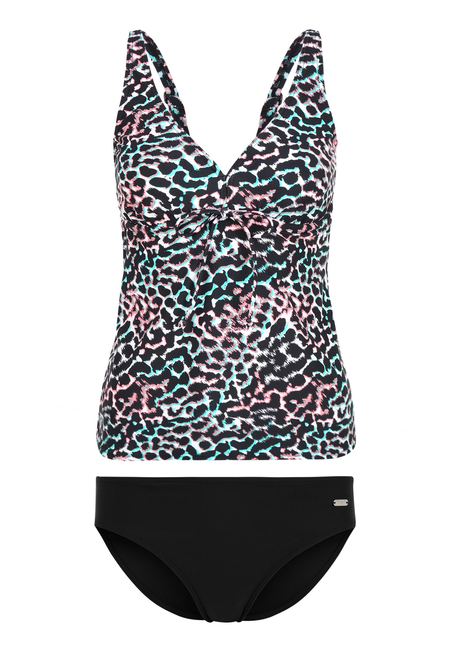 Im tollen Look in Schwarz kombiniert mit bunten Leodruck. In bauchbedeckender Form. Unter der Brust Regulierbar. Verstellbare Träger. Hose etwas höher geschnitten.