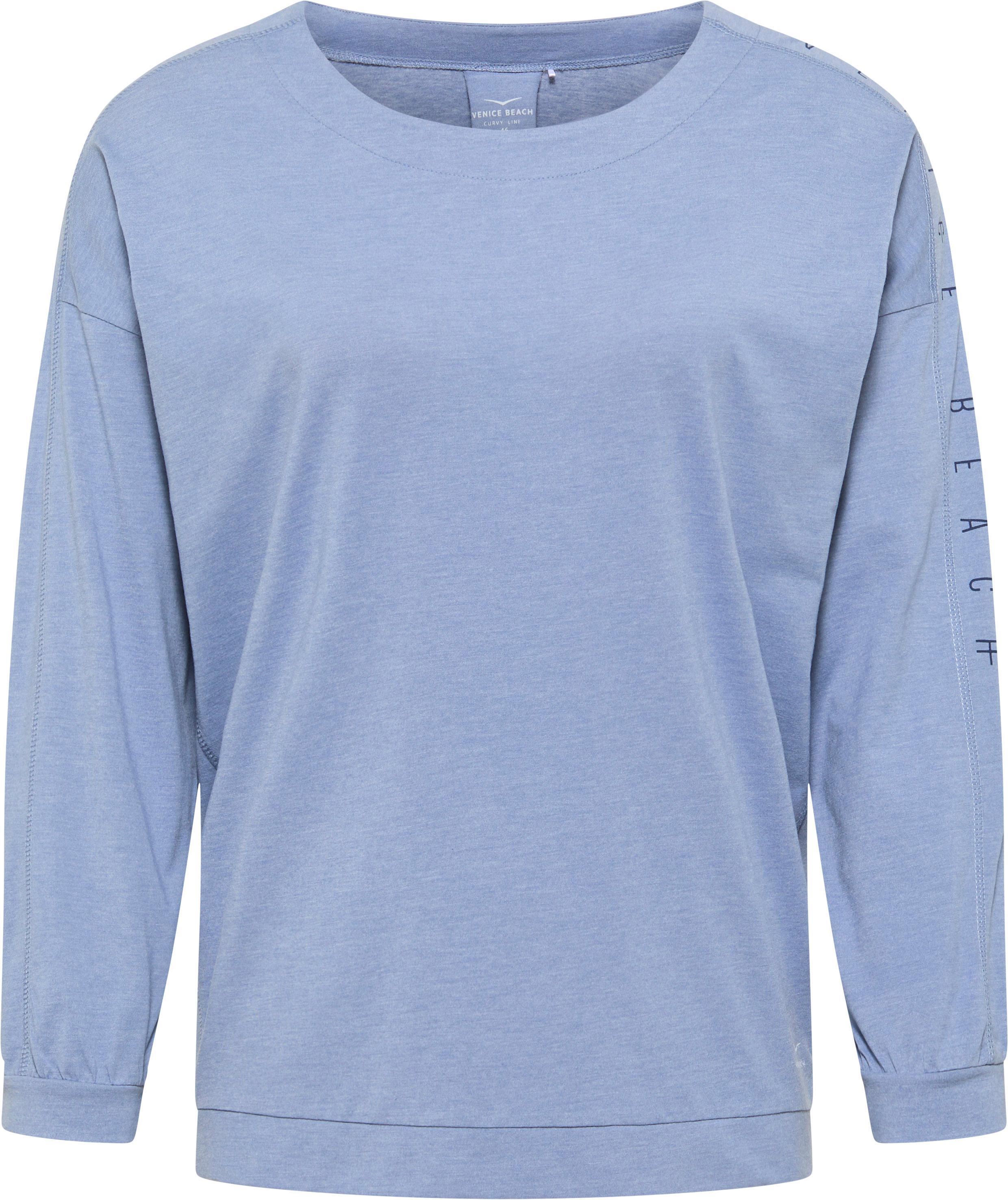 Meliertes Shirt mit 3/4-langen Ärmeln; Rundhalsausschnitt; moderne, überschnittene Schultern; Labelprint am linken Ärmel; lockere Passform; Material 50% Polyester, 50% Baumwolle.