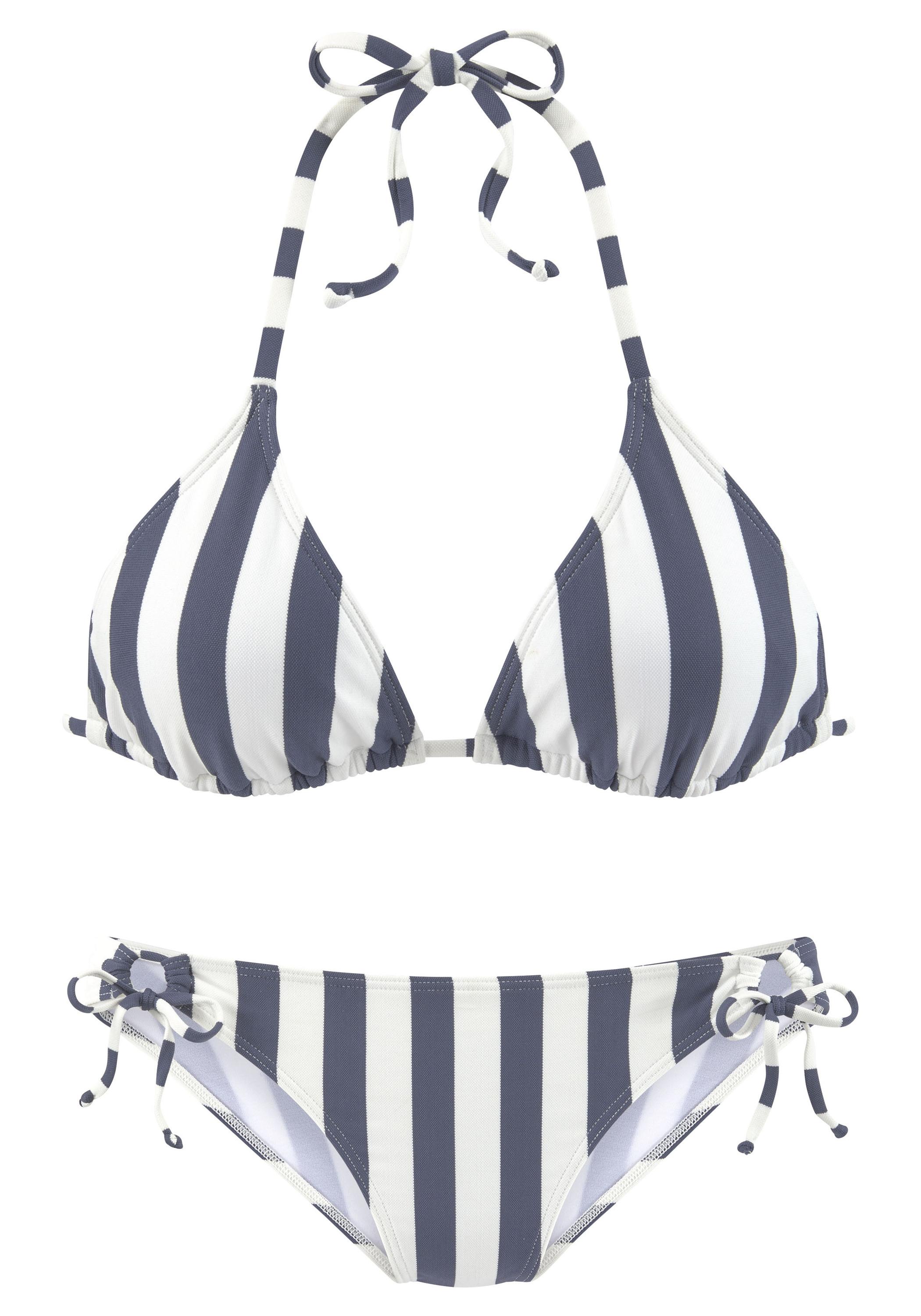 Maritim anmutender Triangelbikini von Venice Beach im Streifenmuster. Herausnehmbare Softcups. Top im Nacken zu binden und im Rücken zu schließen. Hose mit seitlichen Bindebändern. Perfekt zum Sonnen und Baden. Gefütterter Materialmix.