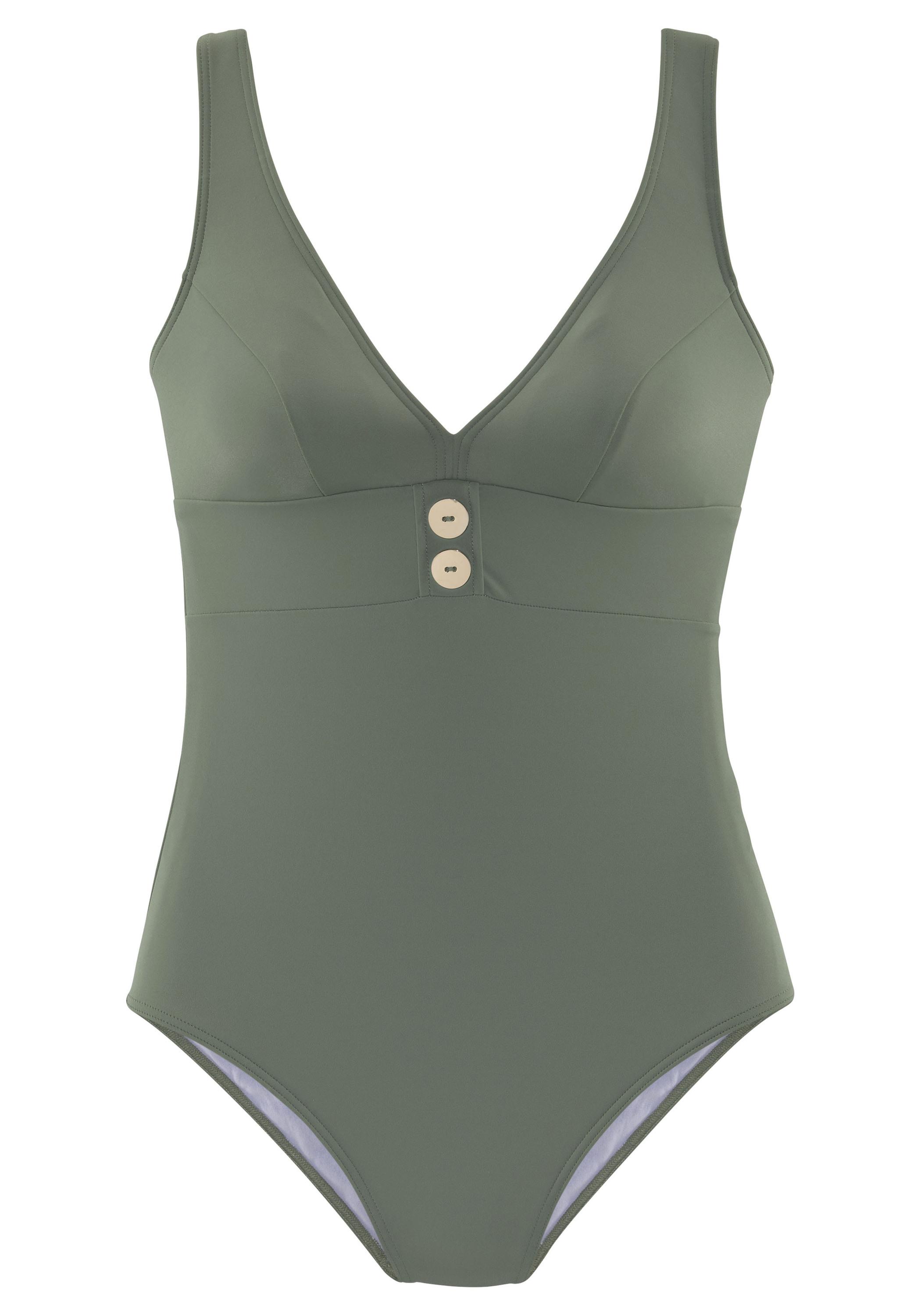 Modischer Badeanzug von Vivance. Verstellbare Träger und integrierte Softcups. Tiefer V-Ausschnitt mit Dekoknöpfen. Tiefer, abgerundeter Rückenausschnitt. Klassische Passform. Angenehme Qualität.