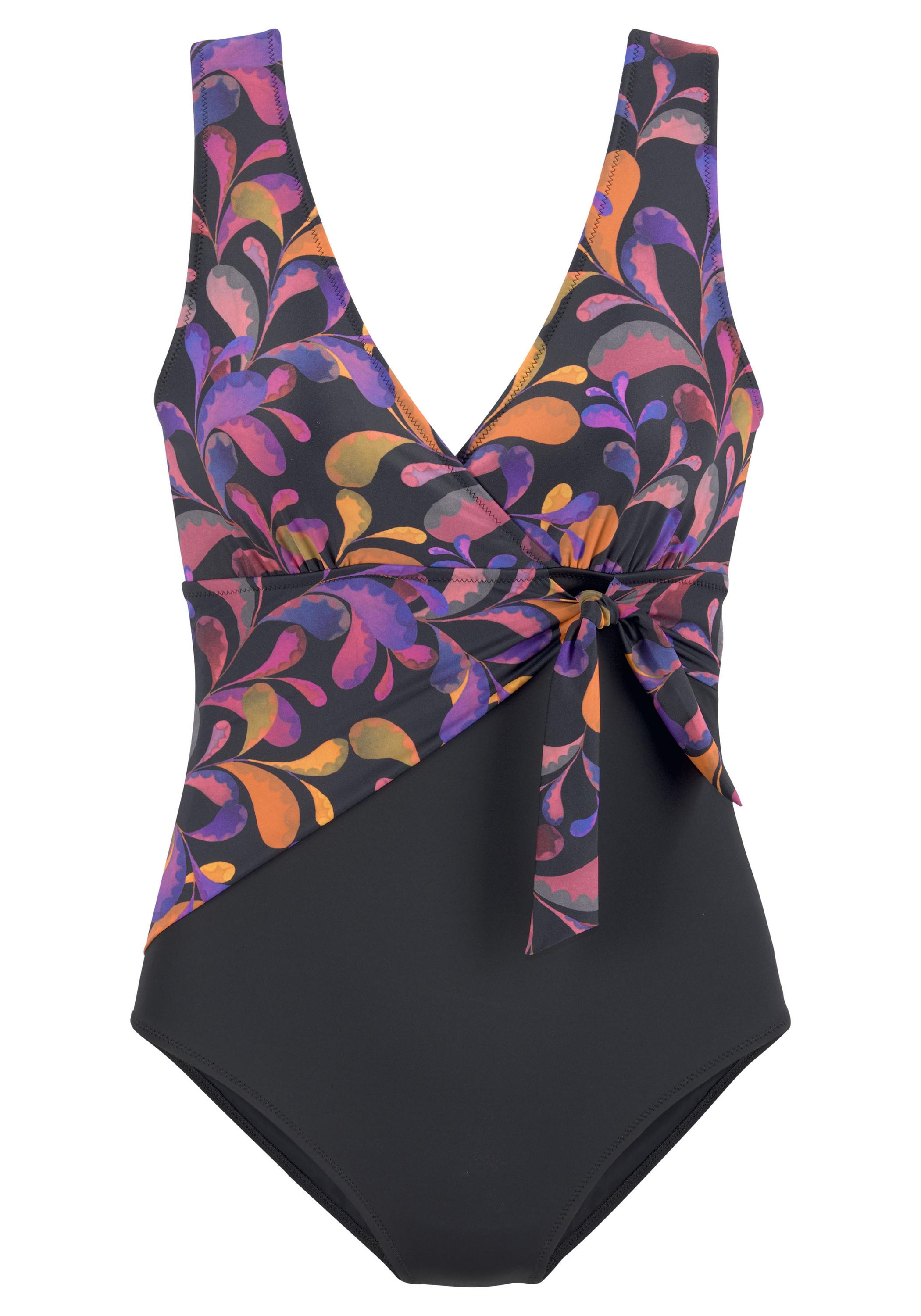 Badeanzug von Vivance. Feminines Design mit Wickeloptik und Zierschleife. Partielles Allovermuster. Herausnehmbare Cups. Tiefer V-Ausschnitt und Rückenausschnitt. Komfortable Passform. Angenehme Qualität.