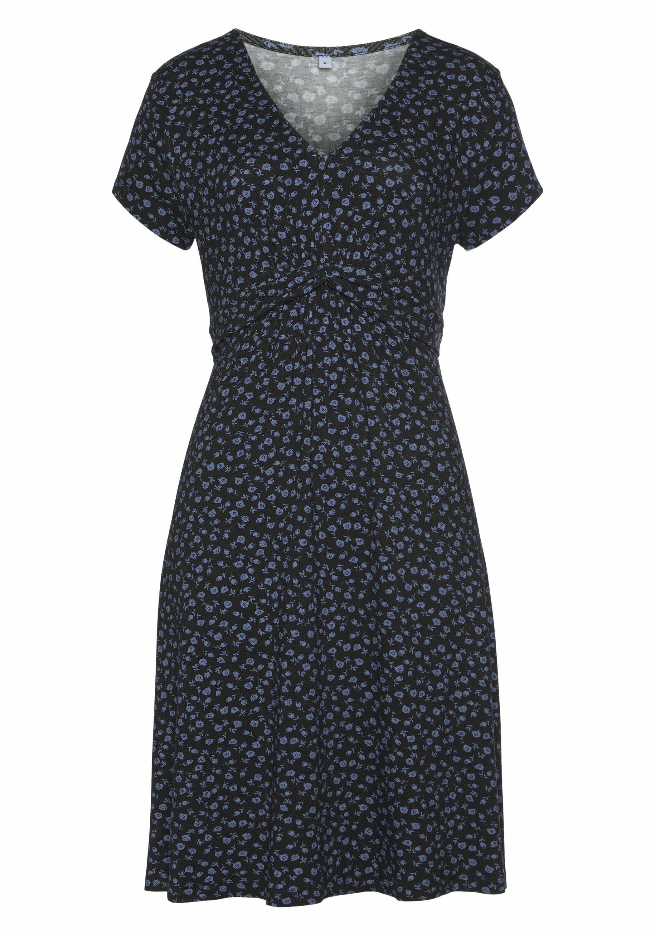 Kleid von VIVANCE mit Alloverdruck, jedes Teil ein Unikat. Mit V-Ausschnitt. Betonte Taille mit Bindeband und Raffung. Ausgestellter Rockteil. Länge ca. 94 cm. Nachhaltige, weich fließende Qualität aus 95% Viskose, 5% Elasthan.