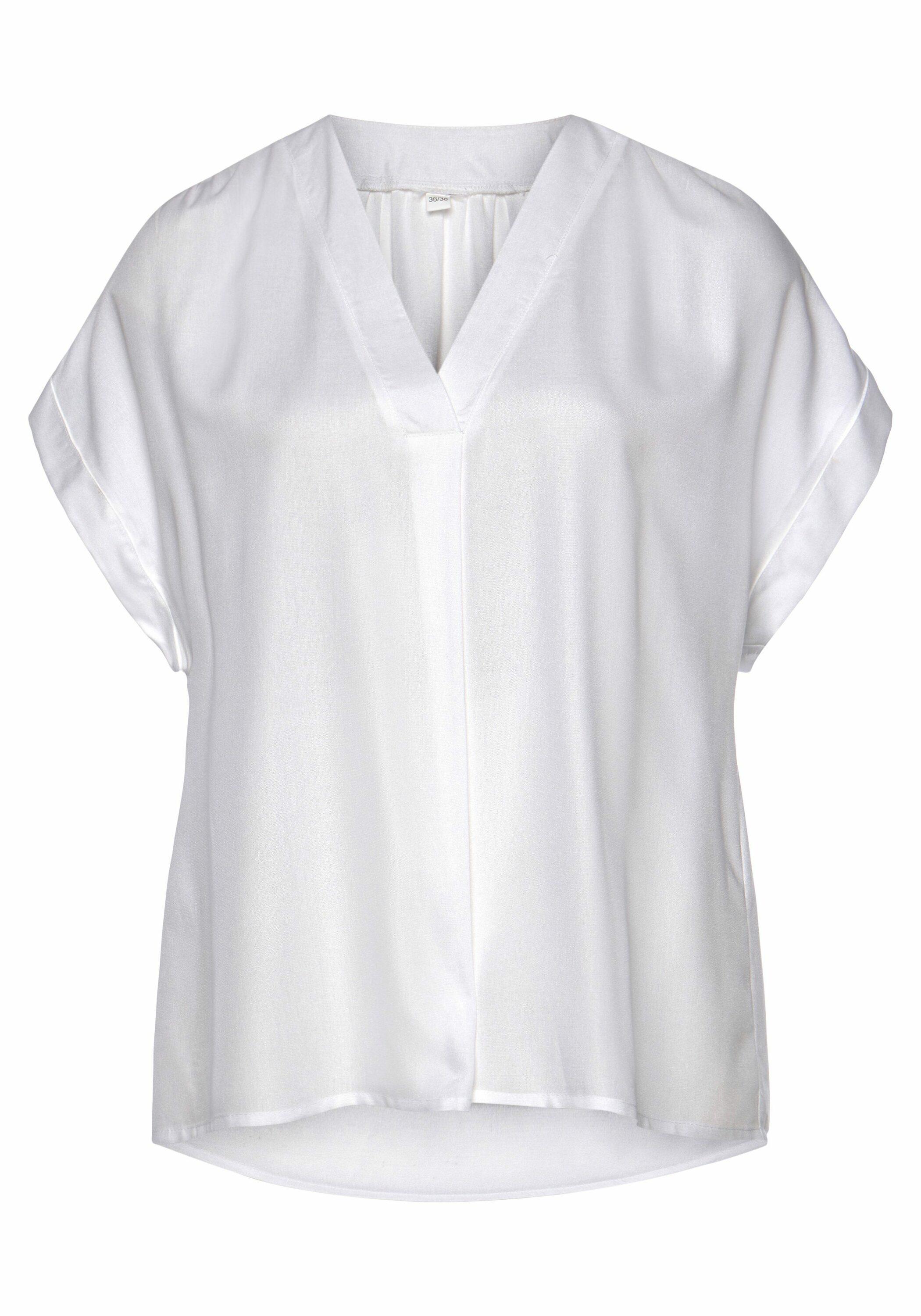 Bluse von Vivance mit V-Ausschnitt mit breiter Blende. Kurze, weite Ärmel mit fixiertem Umschlag. Länge ca. 66 cm. Supersofte, gewebte Qualität aus100% Viskose.