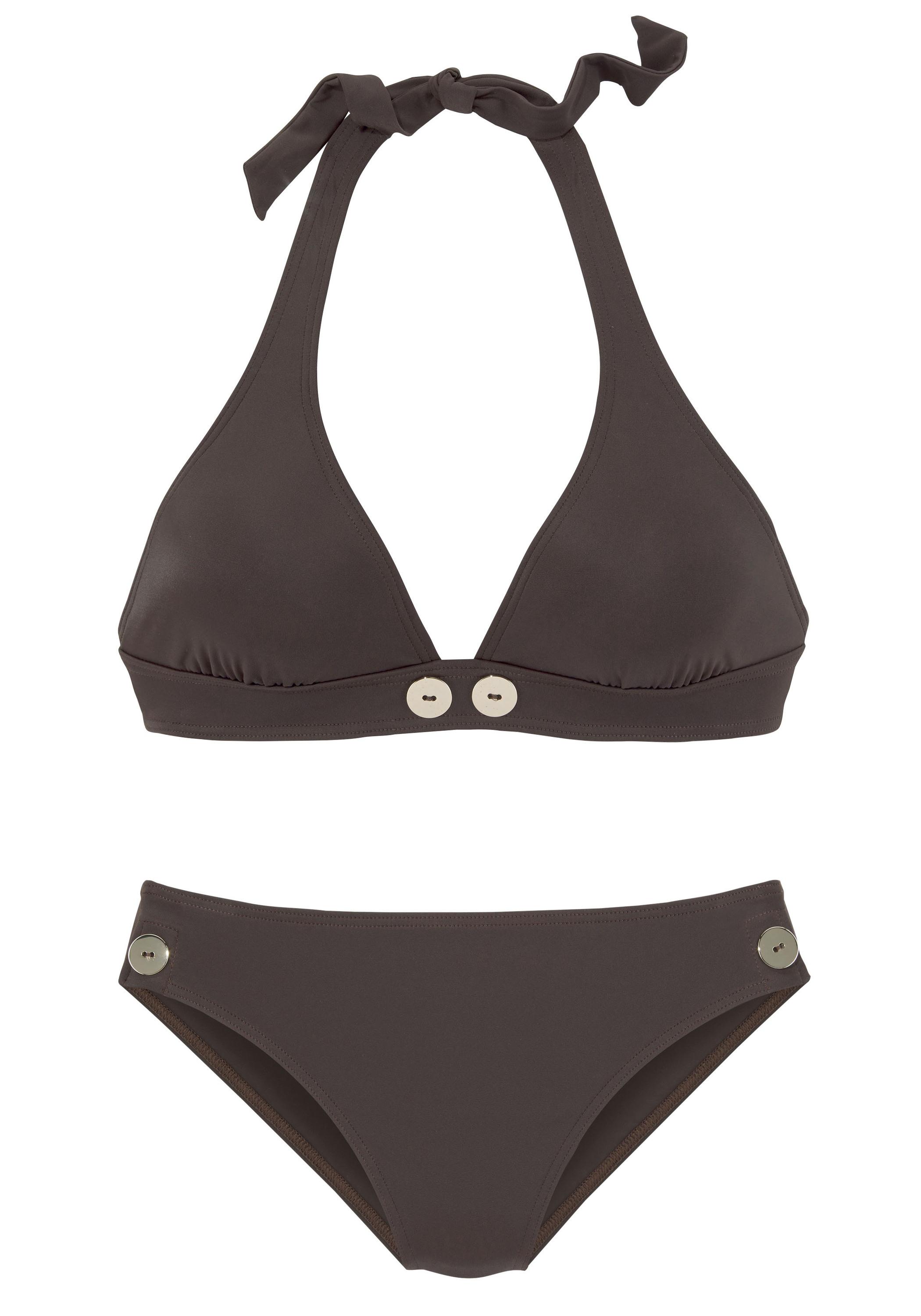 Stylischer Triangel-Bikini von Vivance. Neckholder zum Binden. Seitenstege mit Verschluss im Rücken. Herausnehmbare Softcups. Klassisch geschnittene Bikinihose mit seitlichen Dekoknöpfen. Angenehme Qualität.