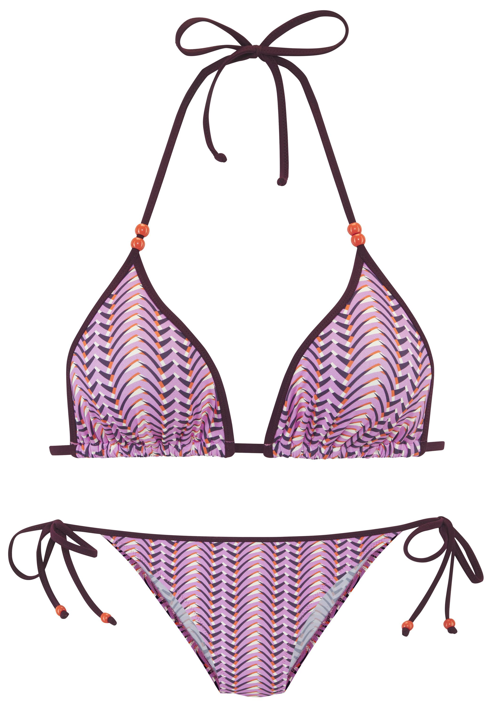 Verspielter Triangel-Bikini von Vivance mit grafischem Alloverprint. Kontrastfarbene Zierperlen an Top und Hose. Oberteil mit herausnehmbaren Softcups. Im Nacken und im Rücken zu binden. Hose seitlich zu binden. Elastische Qualität.