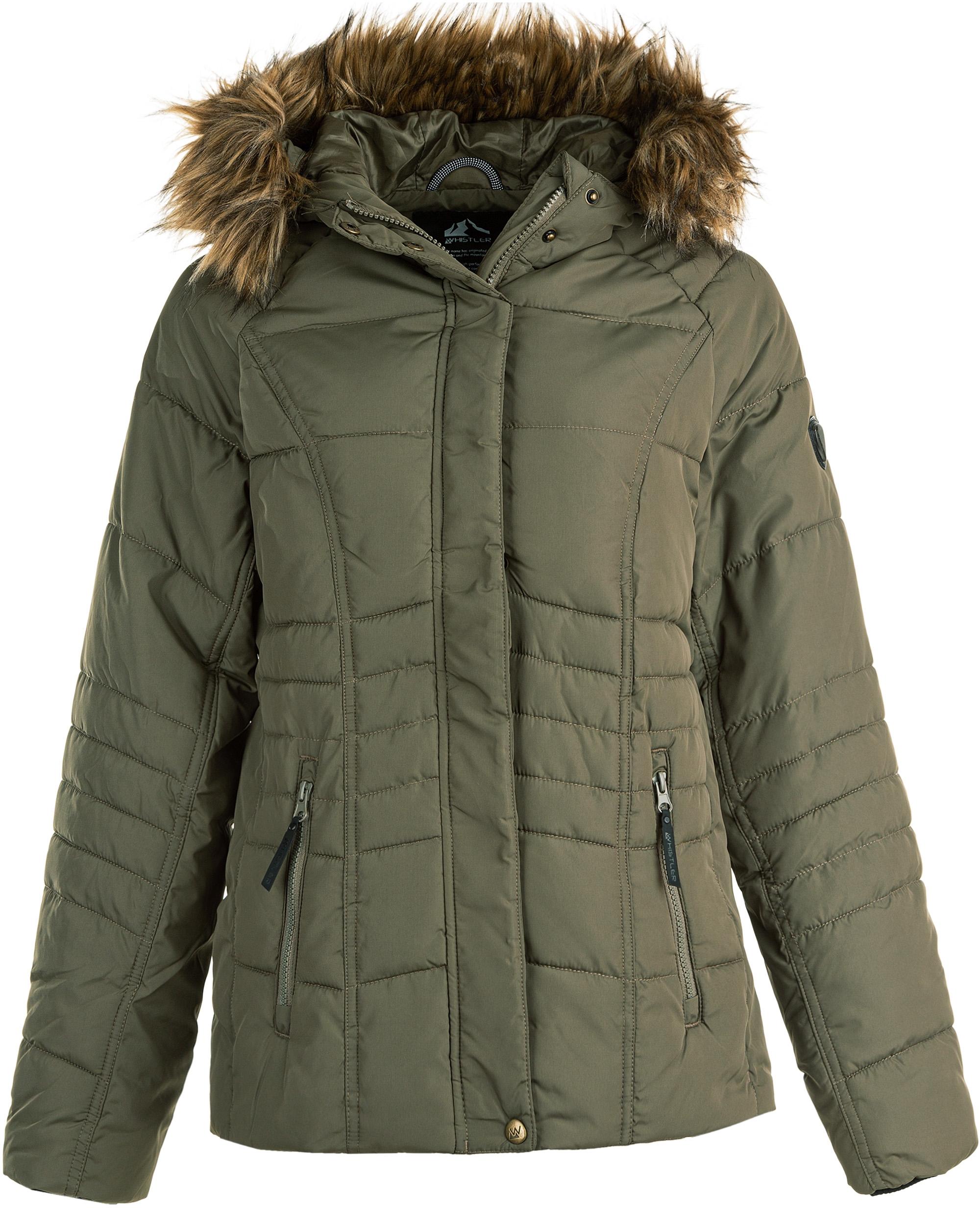 Die schicke Steppjacke CARRY für Damen von WHISTLER aus Dänemark hält auch an kalten Tagen angenehm warm. Das dezente Design lässt sich einfach und schnell zum sportliche Winteroutfit kombinieren. Die Jacke ist mit einer kuschelig-weichen Kunstdaune ausgestattet, welche in der Maschine gewaschen werden kann. Durch die PU-Beschichtung ist die Jacke wasser- und windabweisend. Der hochschließende Kragen mit verstellbarer und abnehmbarer Kapuze schützt vor Wind und Kälte. Der Kunstfellbesatz an der Kapuze ist abnehmbar. Weiter ist die Winterjacke mit einem durchgehenden YKK-Markenreißverschluss ausgestattet. Zusätzlich verfügt die Jacke über einen Kinnschutz, unter dem der Reißverschluss versteckt ist. Die zwei seitlichen Reißverschlusstaschen bieten genügend Platz für alle kleinen Utensilien und wärmen die Hände.