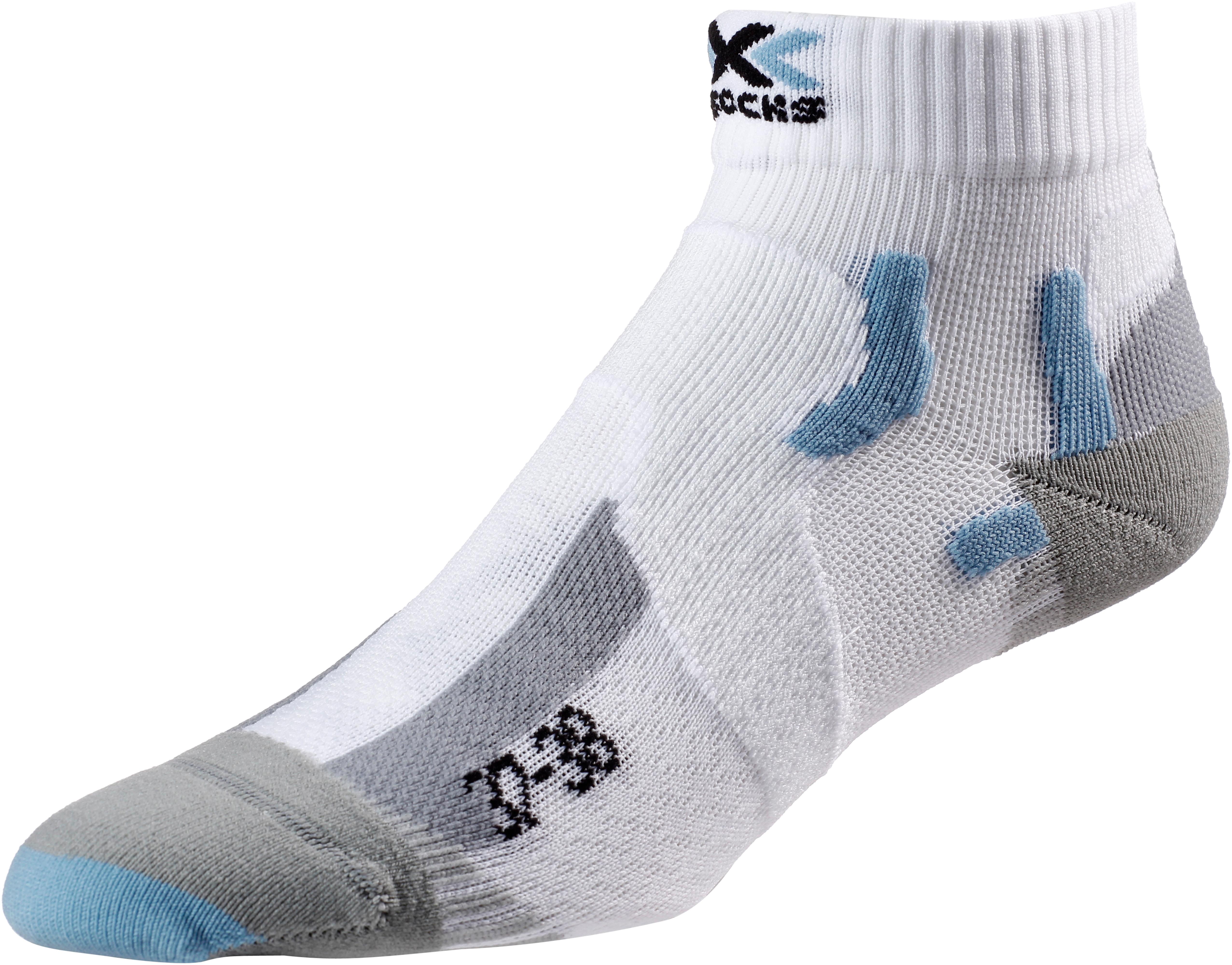X-SOCKS MARATHON. Laufsocke mit unterstützenden Struktureinsätzen und Lüftungskanälen; 43% Polyamid, 29% Polypropylen, 20% Polyethylen, 8% Elastan.