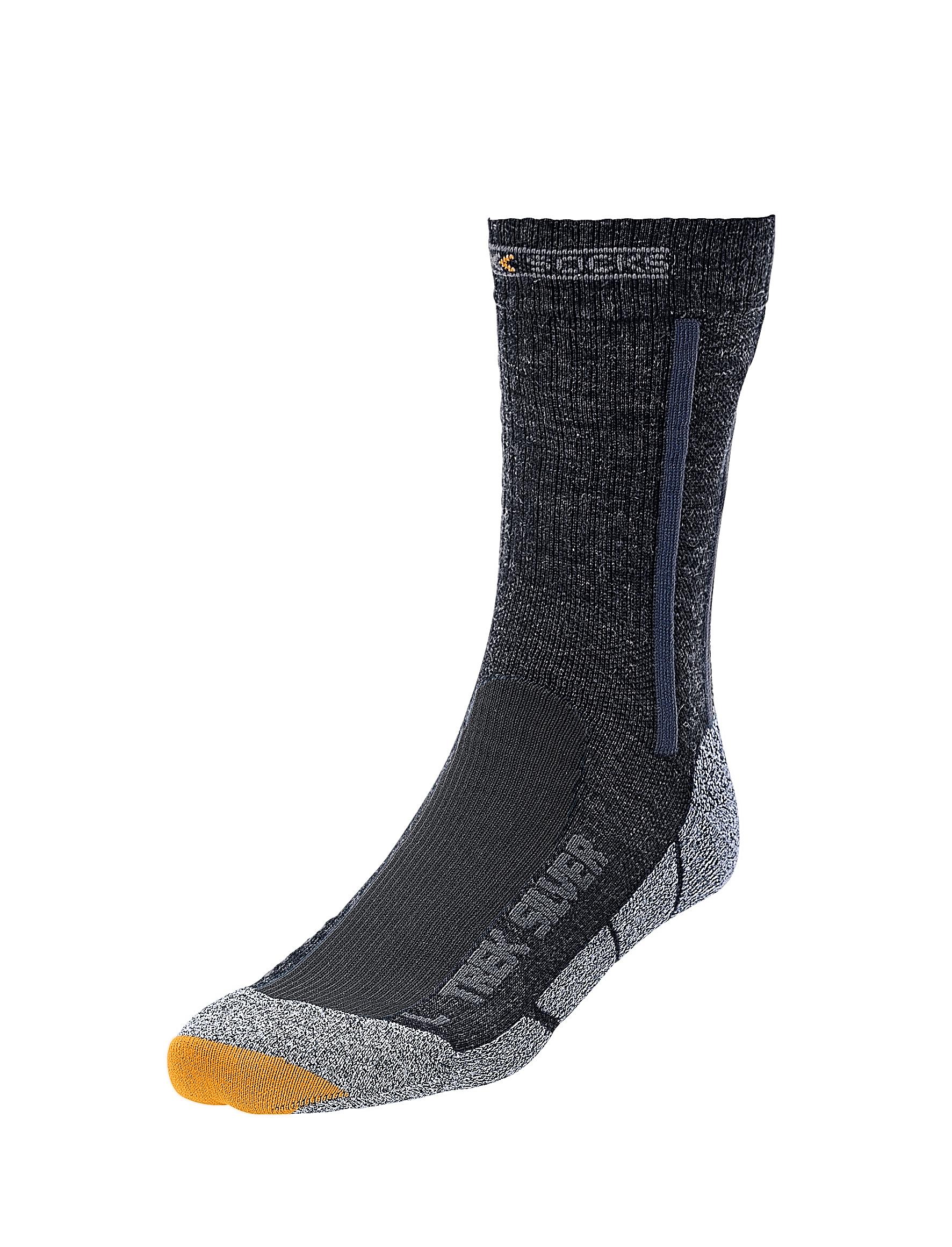 X-SOCKS TREKKING SILVER. Trekkingsocke links/ rechts; Zehenprotektor, X-Cross® Kreuzknöchelbandage; Achillessehnen- und Fersen-Protektor, Rist-Protektor; AirConditioning Channel® für kontinuierliche Belüftung; 48% Polyamid, 21% Wolle (Merinowolle), 11% Polypropylen, 9% Polyester, 7% Seide, 2% Elastan, 2% Silber; Gr. 1(35-36), 2(37-38), 3(39-40).