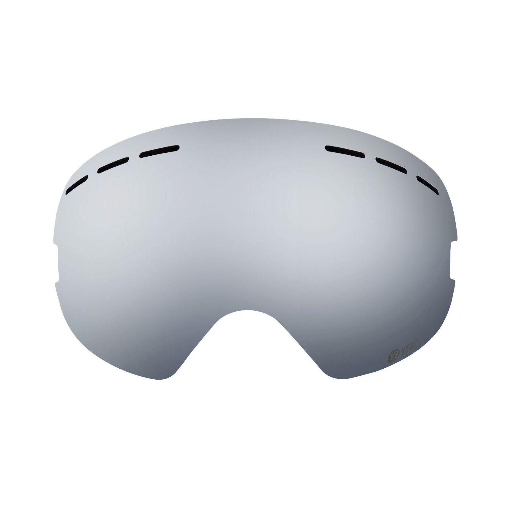 Das XTRM-SUMMIT silber-verspiegelte Wechselglas ohne Rahmen-System bietet dank UV-400-Beschichtung einen 100%igen UV-Schutz (EN 174:2001) sowie einen Blendschutz (VLT 8-9%, Kategorie S3). Die Anti-Beschlag-Technologie sorgt durch thermoisolierende Doppelverglasung mit Anti-Fog-Beschichtung auf der Innenseite (Made in Italy) für eine kristallklare Sicht. Das Wechselglas ist dank Anti-Bruch-System und hoher Kratzfestigkeit für jede Wintersportart geeignet. Die Wechselvorrichtung ermöglicht einen schnellen Austausch der Gläser und somit eine schnelle Anpassung an unterschiedliche Sichtverhältnisse. Weitere YEAZ-Gläser sind als Zubehör erhältlich.