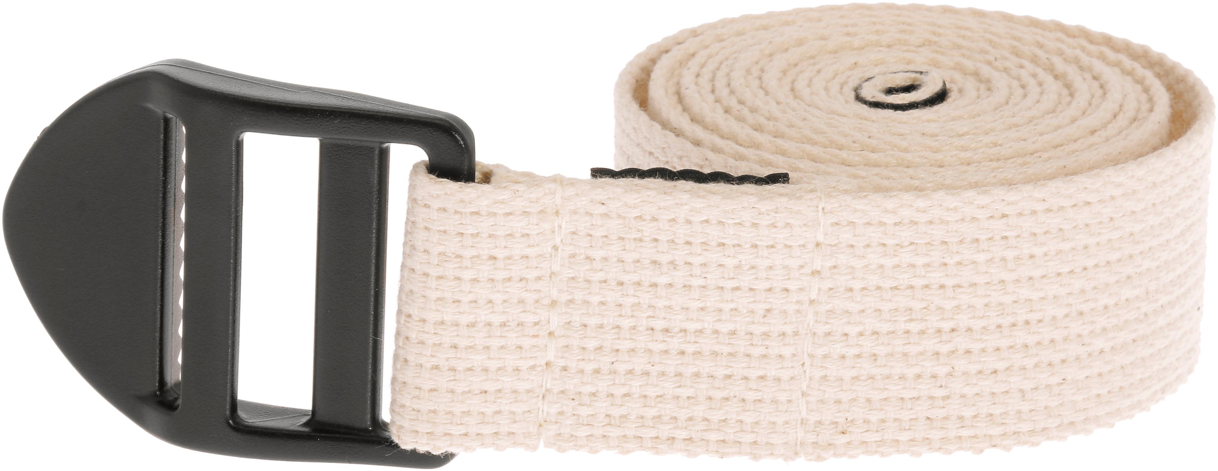 Dicht gewebter Yogagurt aus Baumwolle mit Kunststoffschnalle; stufenlos weitenregulierbar bis Länge: ca. 210 cm; Breite: ca. 3,5 cm.