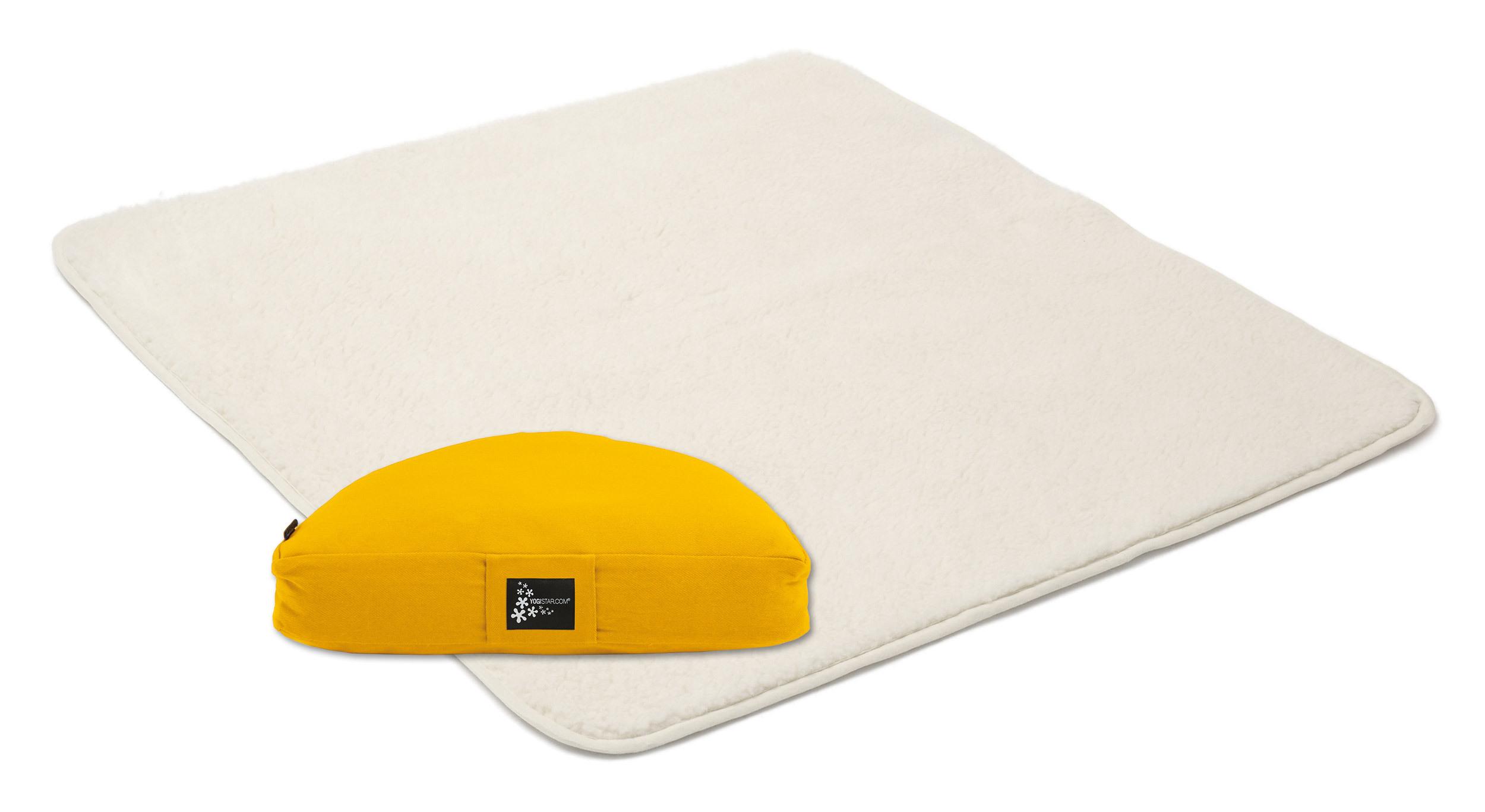 Das Yoga-Set Calm Edition - Meditation besteht aus einem hochwertigen Halbmond - Meditationskissen für einen stabilen und bequemen Sitz und dem Futon/Meditationsunterlage umsäumt, 100 x 100 cm. Qualitäts-Meditationskissen in Halbmond-Form. Der Bezug ist aus einem kräftigen Baumwollstoff gewoben und waschbar. Das Innenkissen mit Füllung ist herausnehmbar. Die Füllung besteht aus Bio-Dinkelspelz (kbA). Die Füllhöhe ist einfach regulierbar durch Hinzufügen oder Vermindern der Dinkelspelz-Füllmenge. Die Füllung passt sich hervorragend der Körperform an, so dass ein bequemes Sitzen mit geradem Rücken begünstigt wird. An diesem Kissen wirst du in deinen Meditationen echte Freude haben. Größe: 35 x 35 x 12 cm Futon/Meditationsunterlage umsäumt, 100 x 100 cm. Weiche, flauschige Naturfasermatte (100 cm x 100 cm) aus reiner Schurwolle (Florhöhe ca. 15 mm) an den Rändern umsäumt, mit rutschfester Naturlatexunterlage.