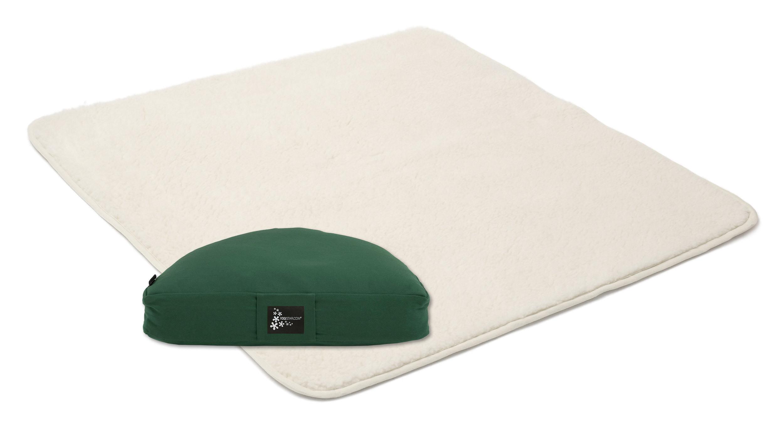 Das Yoga-Set Calm Edition - Meditation besteht aus einem hochwertigen Halbmond - Meditationskissen für einen stabilen und bequemen Sitz und dem Futon/Meditationsunterlage umsäumt, 100 x 100 cm. Qualitäts-Meditationskissen in Halbmond-Form. Der Bezug ist aus einem kräftigen Baumwollstoff gewoben und waschbar. Das Innenkissen mit Füllung ist herausnehmbar. Die Füllung besteht aus Bio-Dinkelspelz (kbA). Die Füllhöhe ist einfach regulierbar durch Hinzufügen oder Vermindern der Dinkelspelz-Füllmenge. Die Füllung passt sich hervorragend der Körperform an, so dass ein bequemes Sitzen mit geradem Rücken begünstigt wird. An diesem Kissen wirst du in deinen Meditationen echte Freude haben. Größe: 35 x 35 x 12 cm Futon/Meditationsunterlage umsäumt, 100 x 100 cm. Weiche, flauschige Naturfasermatte (100 cm x 100 cm) aus reiner Schurwolle (Florhöhe ca. 15 mm) an den Rändern umsäumt, mit rutschfester Naturlatexunterlage.