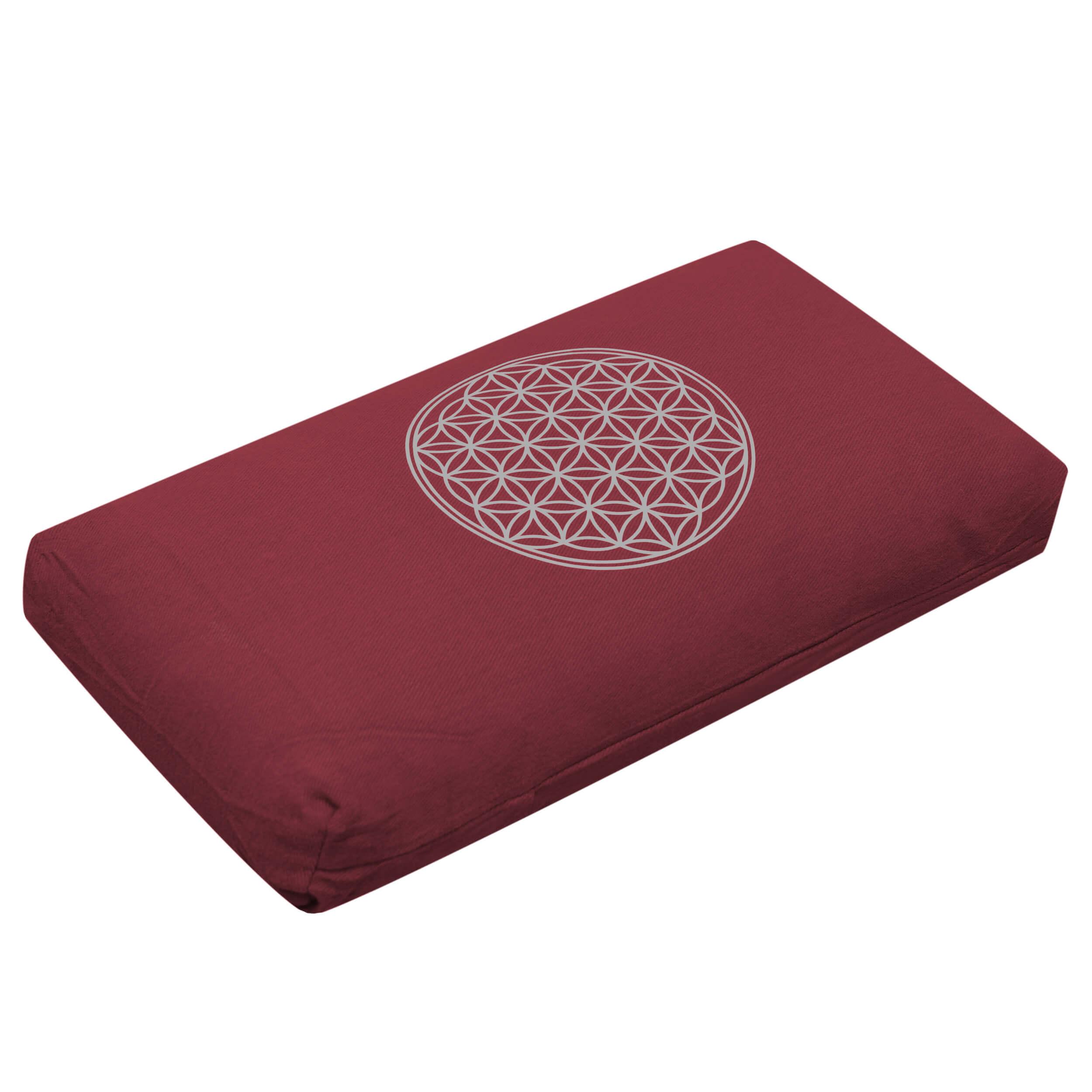Ein leichtes und vielseitig einsetzbares Kissen aus strapazierfähiger Baumwolle mit Kapok-Füllung, bedruckt mit der Blume des Lebens ø130 mm. Ideal zum Unterlegen in zahlreichen Asana-Haltungen, oder auch als einfaches Kissen zum Meditieren zu verwenden. Durch sein leichtes Gewicht und die geringe Größe auch ideal für unterwegs und zum Verreisen. Material: Strapazierfähiger Baumwollköper (Öko-Tex-Standard 100 - 98.T.1099 HOHENSTEIN HTTI - außer bei der Farbe petrol und bordeaux-melange), Innenkissen aus Baumwollnessel, gefüllt mit Kapok. Maße: 37 x 18 x 8 cm Füllung: Kapok ca. 250 g