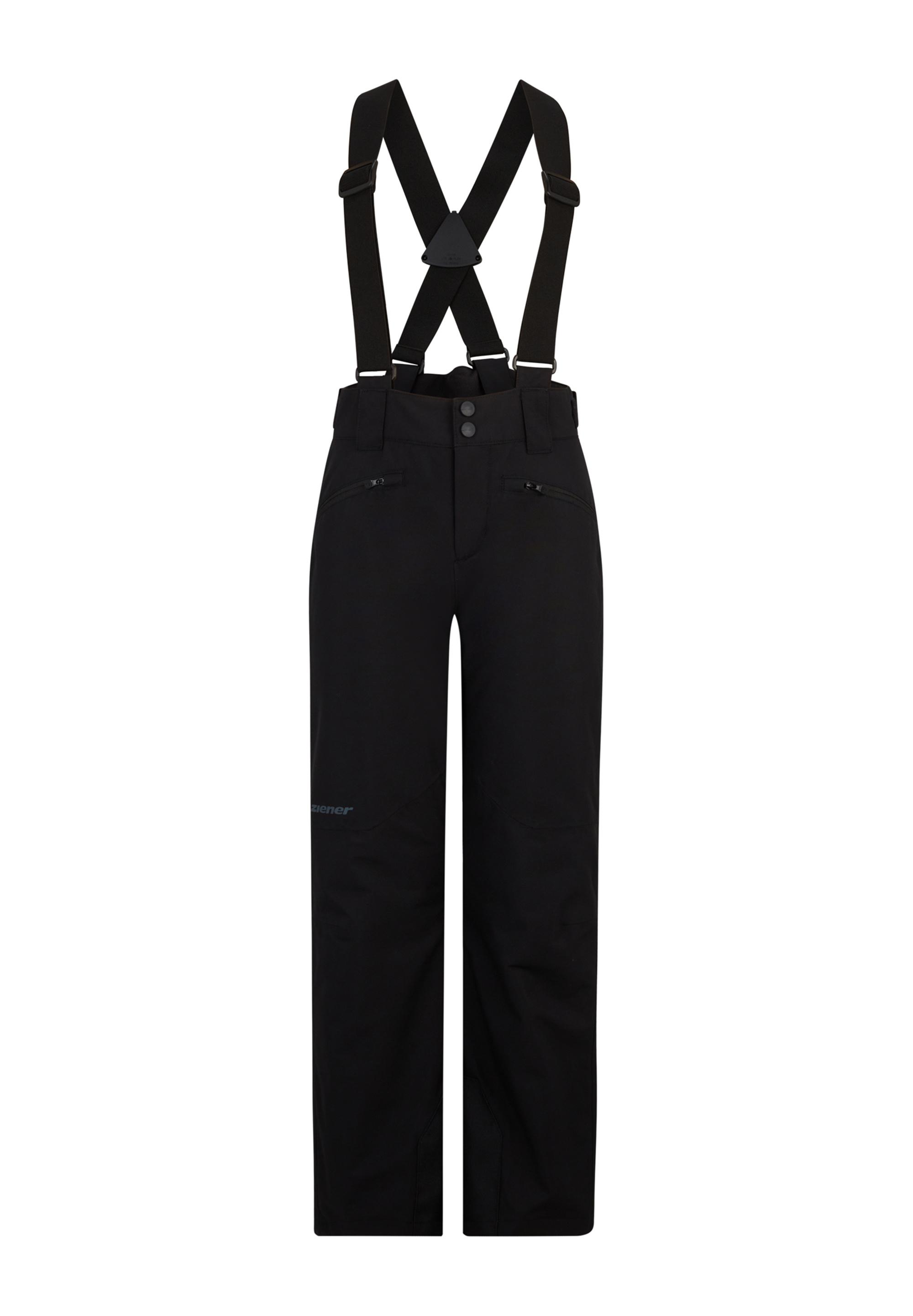 Die funktionelle, wattierte ZIENER Skihose AXI-Z JUNIOR für Jungs punktet mit abnehmbaren Trägern und dem verstärkten Kantenschutz. Die atmungsaktive, wasser- und winddichte ZIENER AQUASHIELD® Membran (Wassersäule 10.000mm/Atmungsaktivität 10.000g/m²/24h) sorgt für ein warmes und trockenes Klima. Die Regular Fit Hose hält optimal Nässe ab und bleibt dank 100g/m² Wattierung angenehm warm. Die Imprägnierung der Hose ist PFAS-frei. Der Außenstoff ist bluesign® und Standard 100 by OEKO-TEX® zertifiziert. Der höher geschnittene Rücken sowie die Weitenregulierung am Bund mit zusätzlichen Gürtelschlaufen sorgen für zusätzlichen Tragekomfort. Der Schneefang und die verschweißten Nähte sind weitere Features, die die Hose zum idealen Pistenbegleiter machen. Die Skihose ist zusätzlich mit reflektierenden Designelementen versehen.