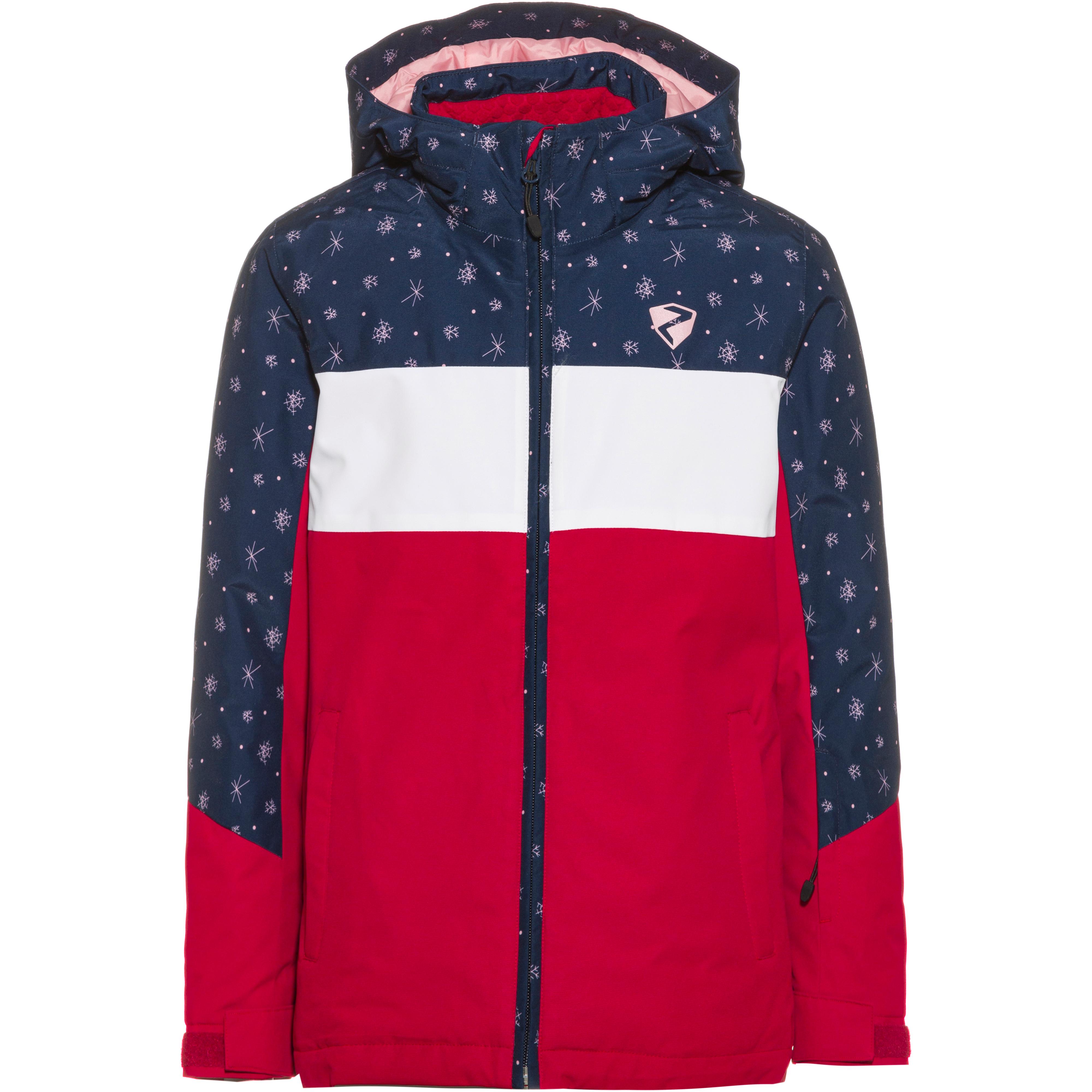 Skijacke mit coolen Animal-Prints und Colourblock-Elementen; mit wasser- und winddichter sowie atmungsaktiver Aquashield®-Technologie; feste Kapuze; Kragen mit Kinnschutz; unterlegter Frontreißverschluss; 2 verdeckte Reißverschlusstaschen; 1 Goggle-Tasche aus Mesh auf der Innenseite; durch Klettriegel verstellbare Ärmelabschlüsse mit elastischen Innenbündchen; 1 Liftpasstasche; rutschfester Schneefang; Kordelzug im Saum; Wassersäule 10.000 mm; leichte 120 g-Wattierung; Wärmezonen am Rücken sorgen für ein optimales Körperklima; Material 100% Polyester.