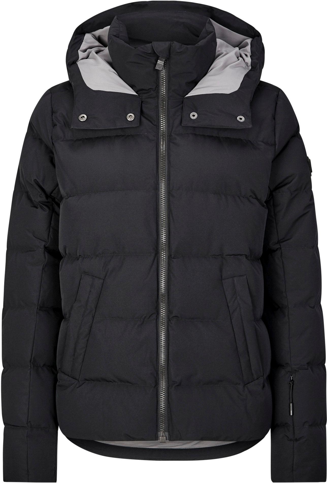 Dezent gemusterte, gesteppte Skijacke in leichter A-Form; feste Kapuze mit Druckknöpfen auf der Vorderseite; Kinnschutz am Kragen; durchgehender Frontreißverschluss; 2 Reißverschlusstaschen; 1 Liftpasstasche; 1 Skibrillen- und 1 Handytasche innen; herausnehmbarer Schneefang; isoliert mit waschbarer, umweltfreundlicher CLOMAX® HALO MicroDown; wind- und wasserdicht sowie atmungsaktiv dank Aquashield®-Technologie; Wassersäule 10.000 mm; komprimierbar; ohne PFC hergestellt; Material 100% Polyester.