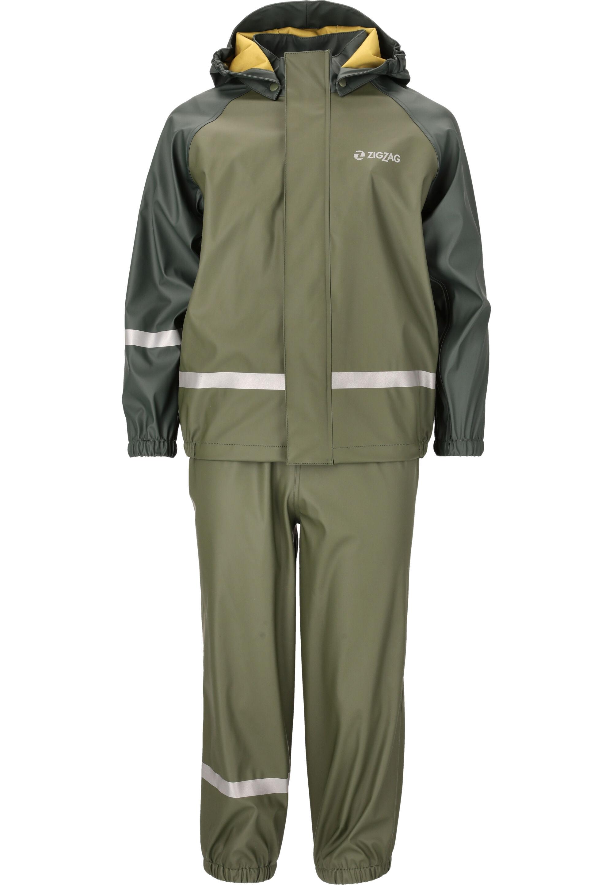 Mit dem Regenanzug GILBO für Kinder von ZIGZAG aus Dänemark können Deine Kinder bei jedem Wetter draußen spielen und toben! Der zweiteilige Anzug schützt dank der 5.000 mm Wassersäule zuverlässig vor Regen, Wind und hält die Kinder trocken. Dafür sorgen zusätzlich die verschweißten Nähte, die keinerlei Wasser durchlassen. Große 360 Grad reflektierende Elemente sorgen stets für eine gute Sichbarkeit im Straßenverkehr im Dunkeln. Für ein besseres Tragegefühl sorgt das weiche Futter im Inneren des Anzugs. Besonders praktisch sind auch die abnehmbare Kapuze und der hohe Stehkragen, die vor Wind und Regen schützen. Eine individuelle Anpassung der Regenhose ermöglichen Hosenträger. Das macht den Regenanzug GILBO von ZIGZAG zu einem tollen Begleiter an Regentagen!